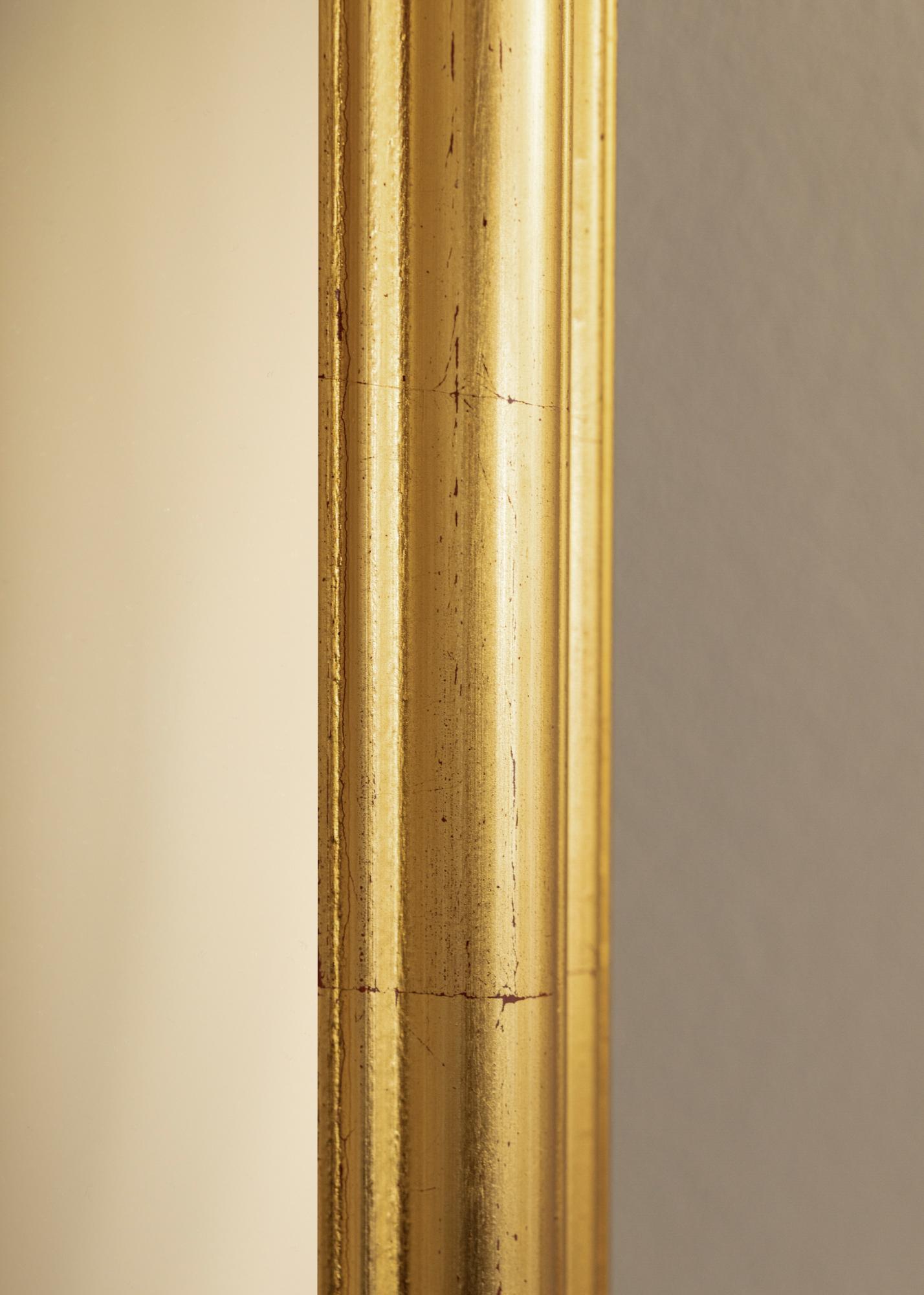 La cornice è realizzata in legno di ayous e ha un profilo dolcemente curvato che contribuisce all'aspetto sofisticato dello specchio. La superficie è anticata con sottili crepe e piccoli dettagli scuri, che donano allo specchio un autentico tocco vintage. La finitura dorata crea un'atmosfera calda e classica, perfetta per dare alla tua casa un tocco di eleganza senza tempo.