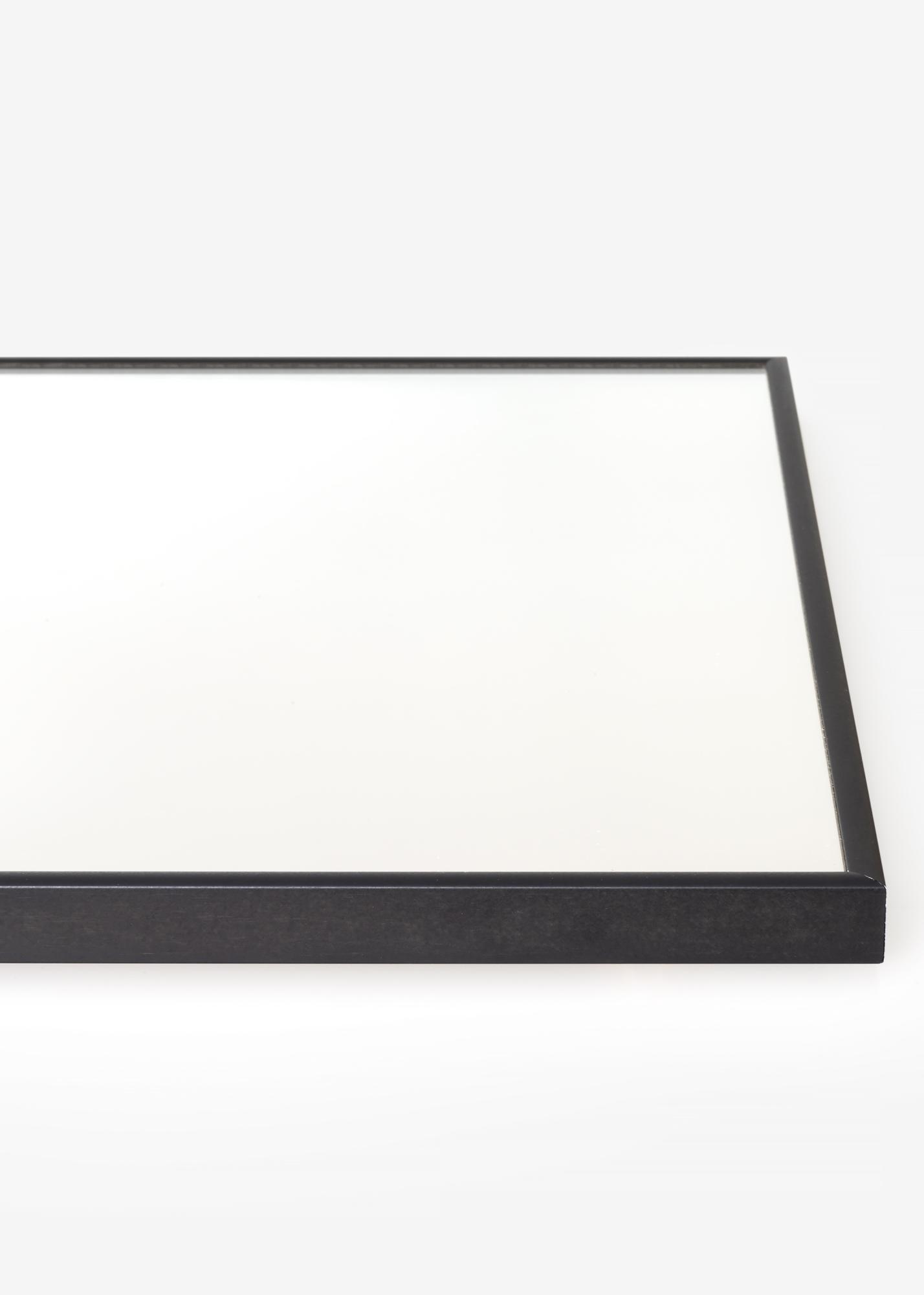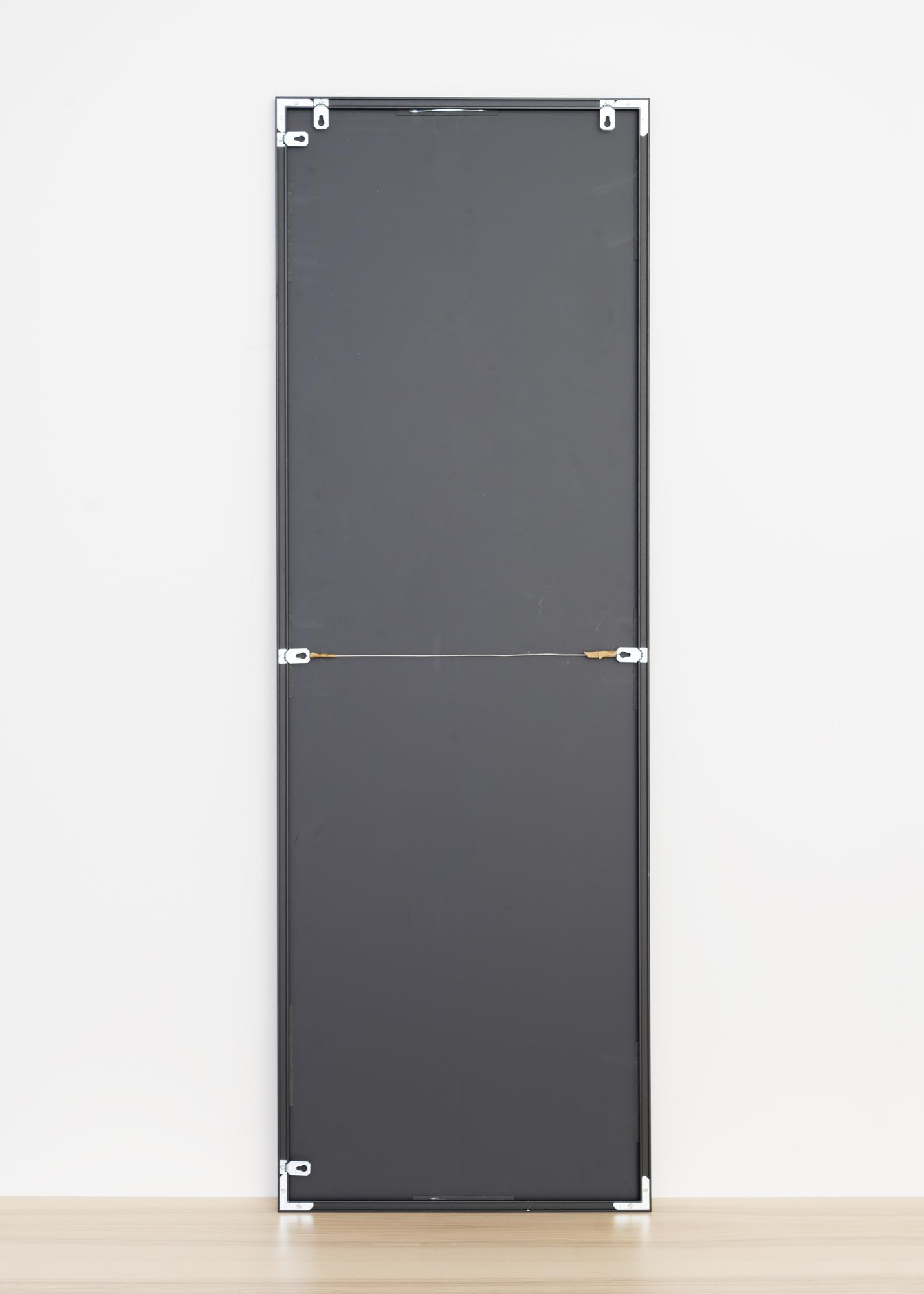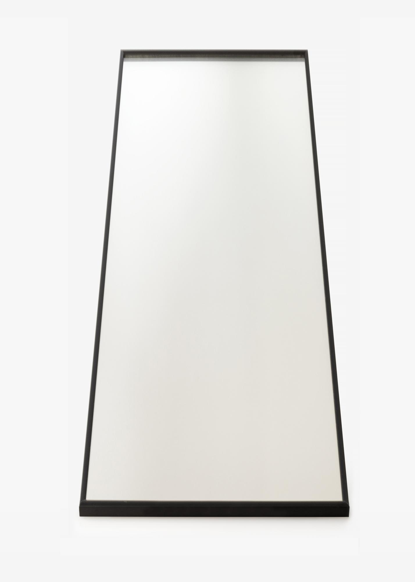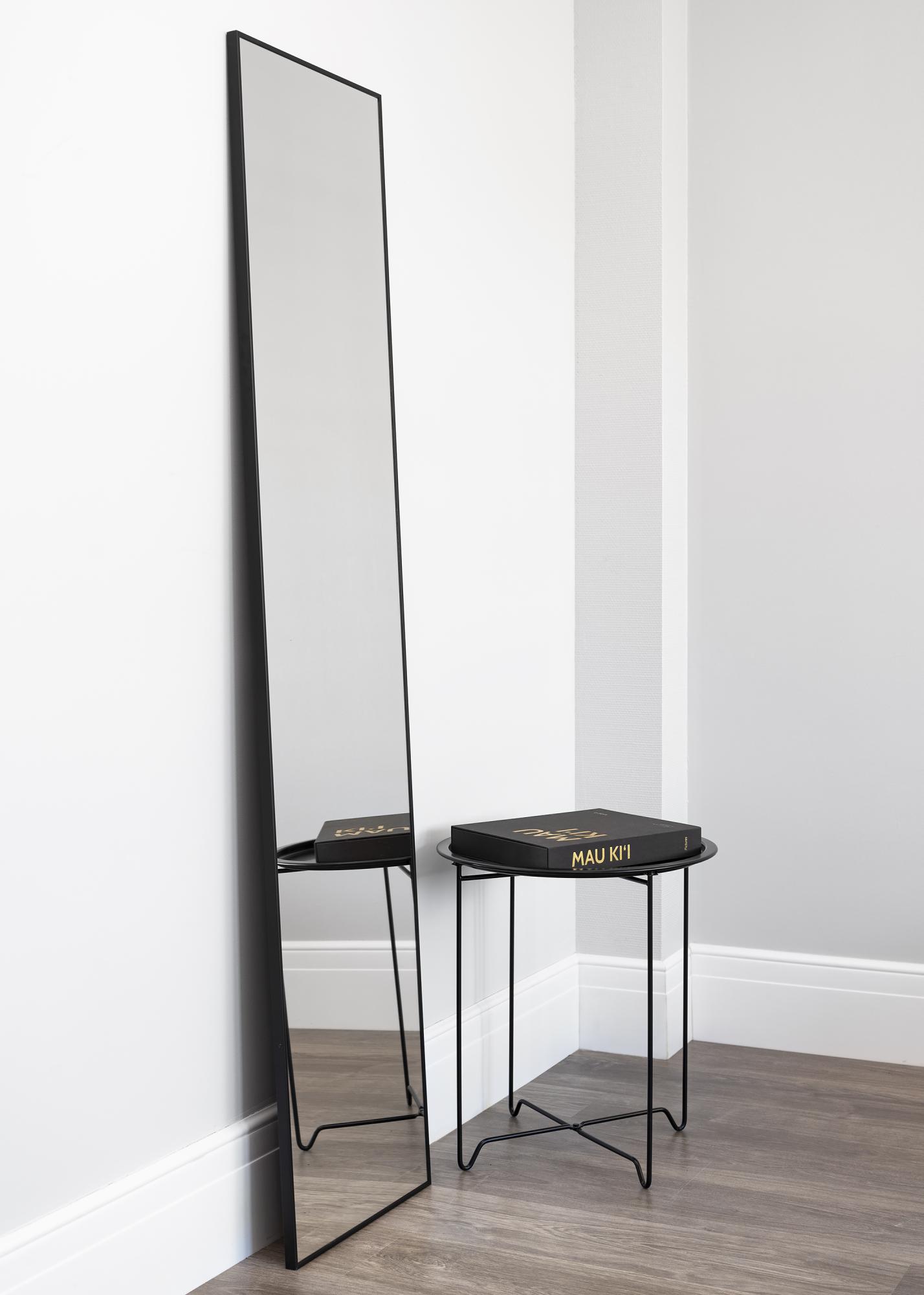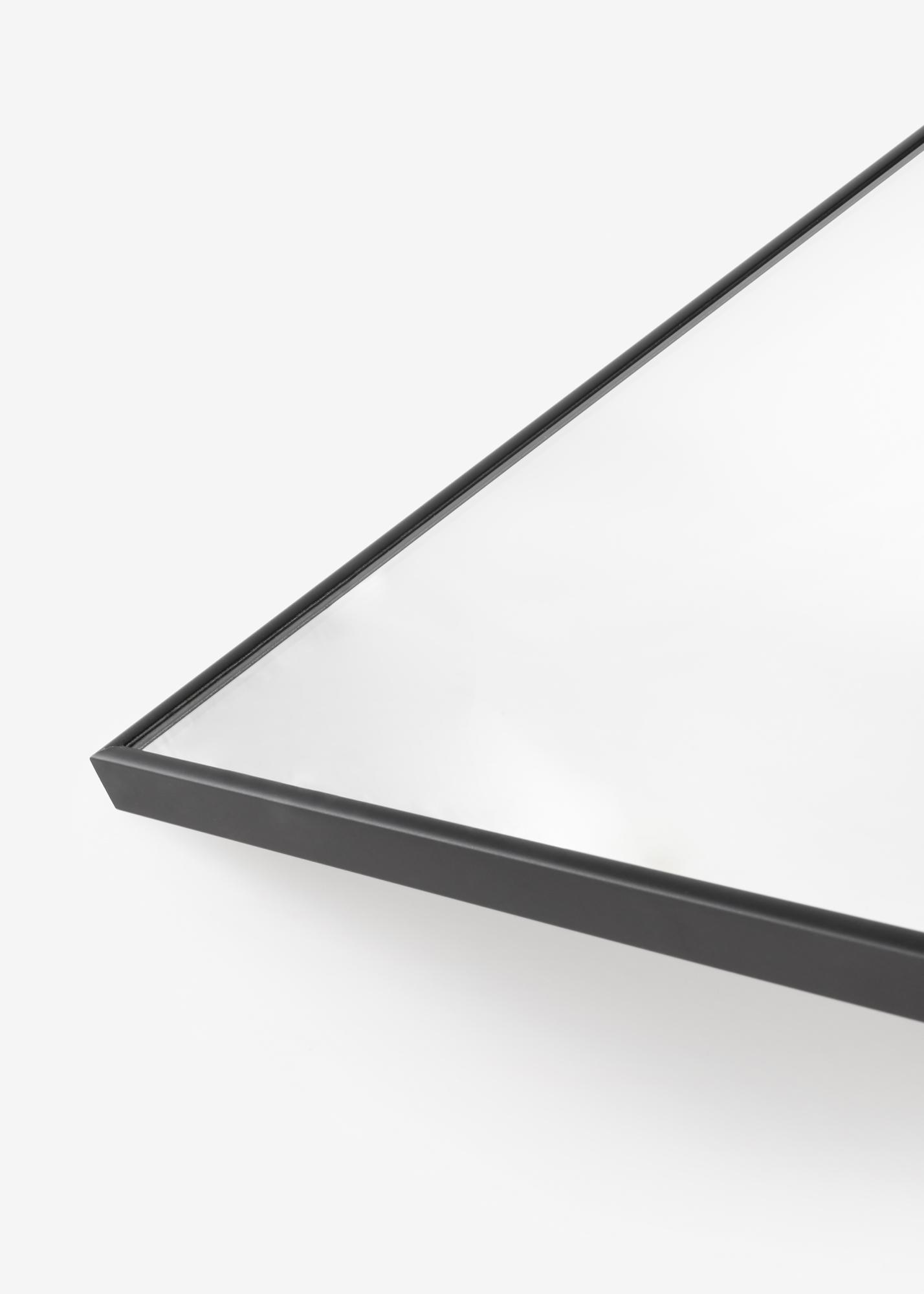 Uno specchio elegante con cornice in alluminio nero. Lo specchio è dotato di supporti da parete intelligenti, che lo rendono facile da appendere.