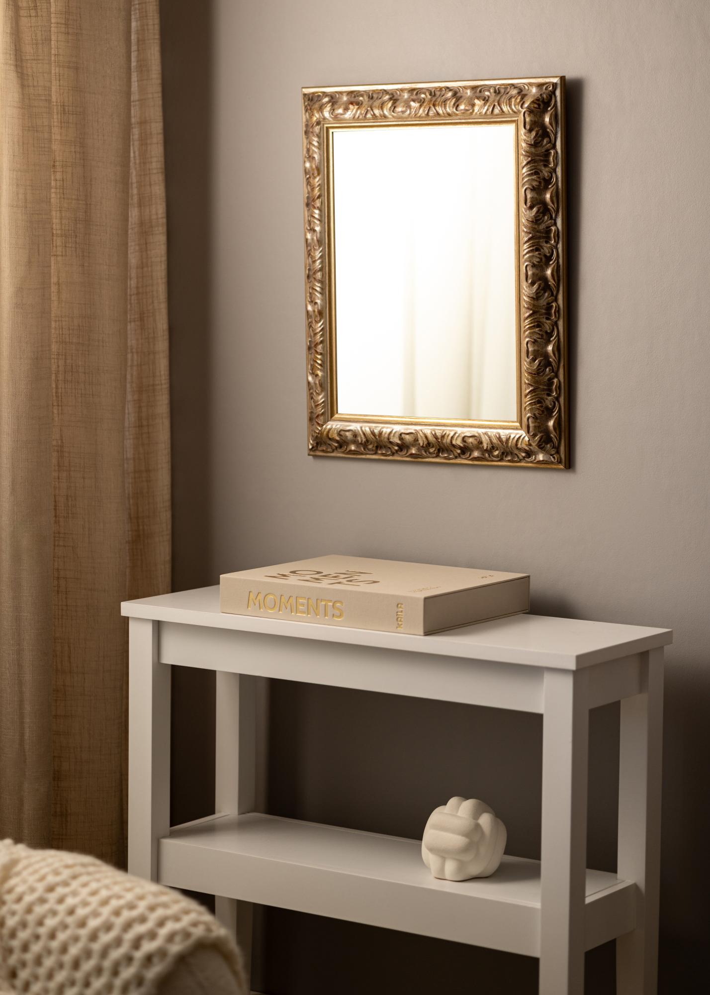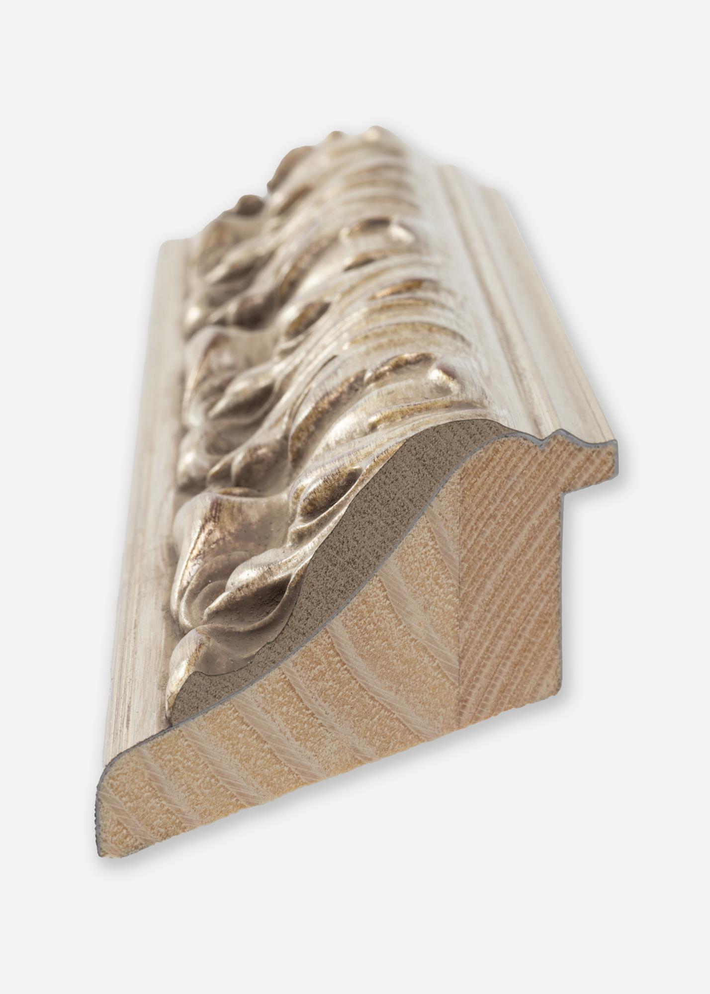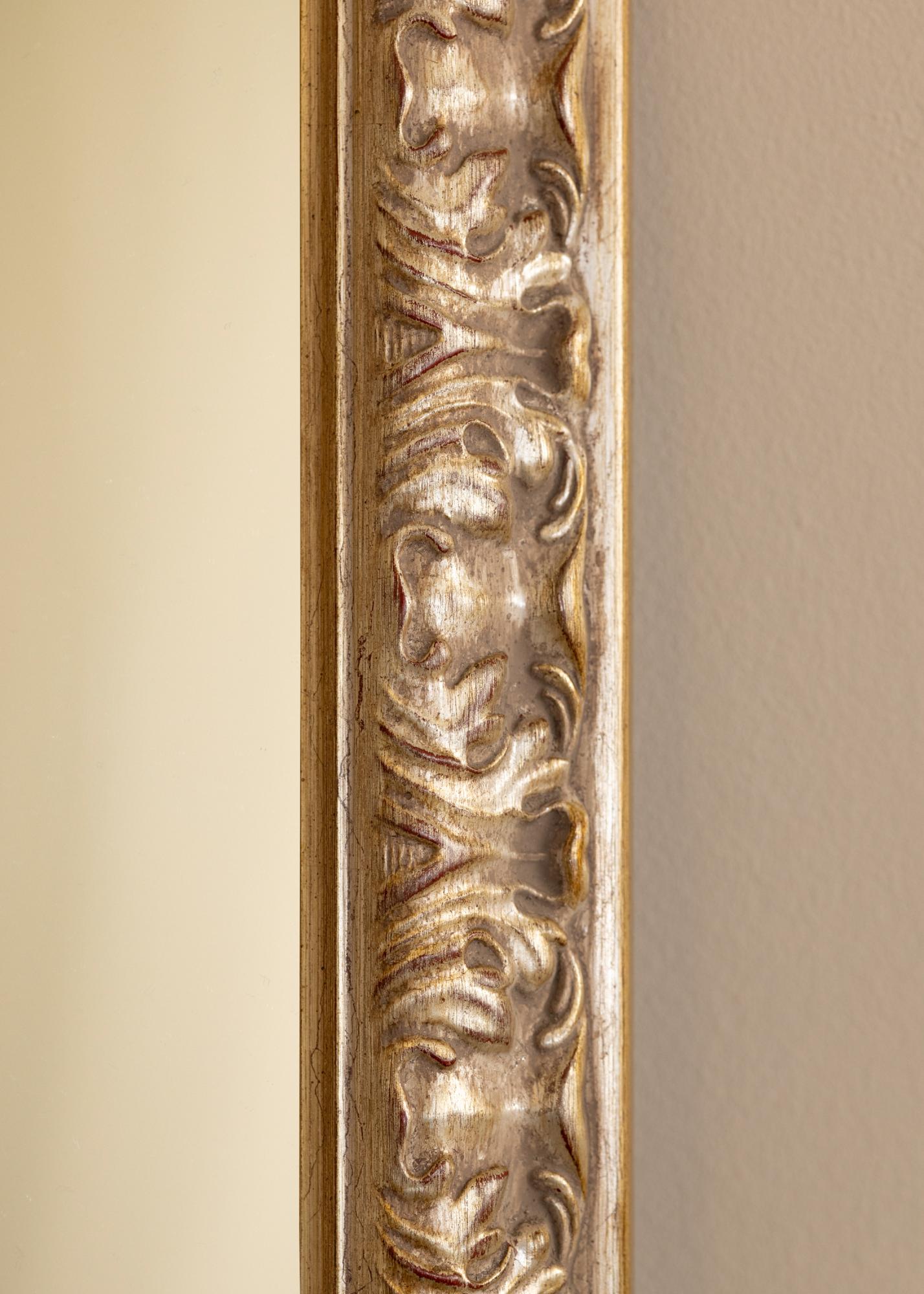 La cornice è realizzata in pino e ha una finitura argento anticato con dettagli dorati sottili e accenti rossi. Questa combinazione di colori crea un bel contrasto e conferisce allo specchio un'espressione classica e sofisticata. L'aspetto decorativo rende lo specchio perfetto per incorniciature in cui si ricerca un tocco elegante.
