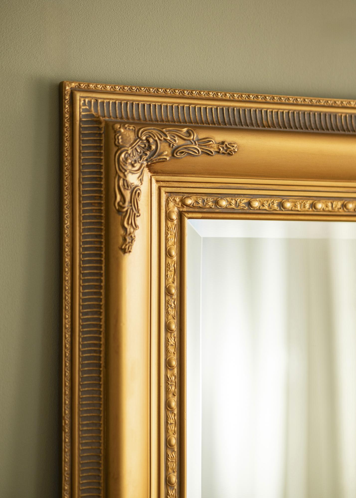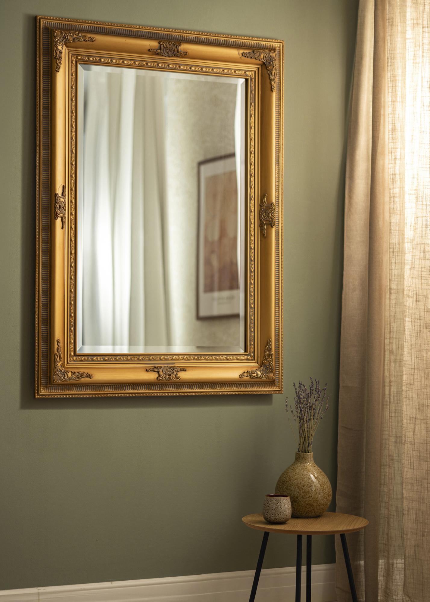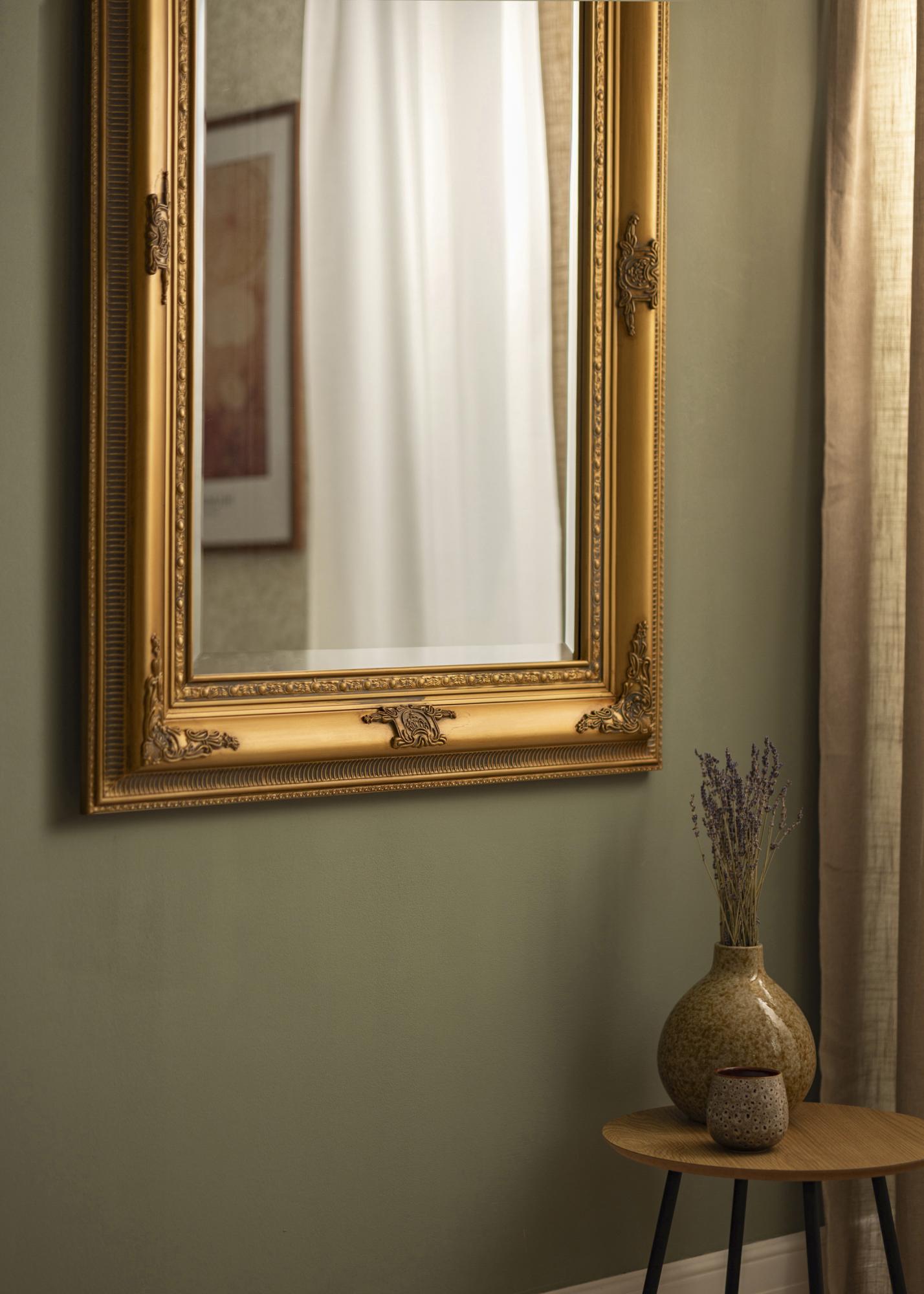 Specchio con un bel profilo dorato dall'aspetto antico, decorato con ornamenti floreali. Lo stile classico della cornice dello specchio si adatta a stili d'arredamento con mobili antichi, ma può anche essere utilizzato per creare un interessante contrasto in un arredamento moderno e minimalista. Lo specchio è bello da appendere sia nell'ingresso, nella camera da letto che in un guardaroba e si abbina bene con accessori d'arredo in ottone o tonalità dorate.
