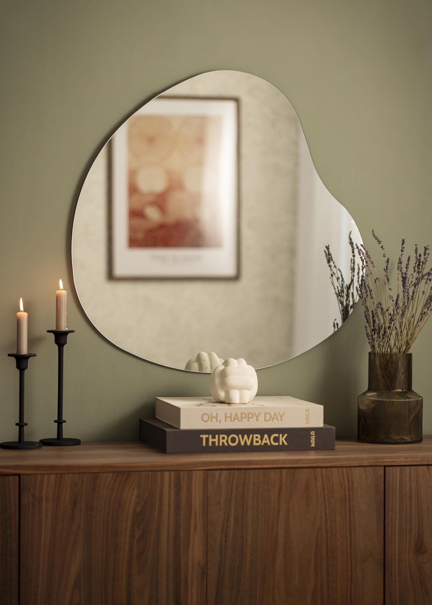 Lo specchio ha una forma morbidamente sagomata e asimmetrica che si incurva graziosamente, dando un'impressione di movimento e morbidezza. Questo design rende lo specchio un dettaglio artistico sulla parete, mantenendo allo stesso tempo la sua funzione pratica.