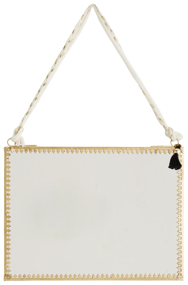 Bello specchio di Madam Stoltz, che diventa un bel dettaglio in tutte le stanze della casa. Lo specchio ha una cornice dorata elegantemente sagomata e un fiocco decorativo in un angolo. La cinghia di sospensione è in cotone, che dà allo specchio una sensazione bohémien. Lo specchio da parete ha una dimensione di 20x15 cm e le dimensioni compatte lo rendono molto bello da abbinare ad altri modelli di specchi. È fatto a mano, il che significa che ogni singolo articolo può variare leggermente nell'aspetto.