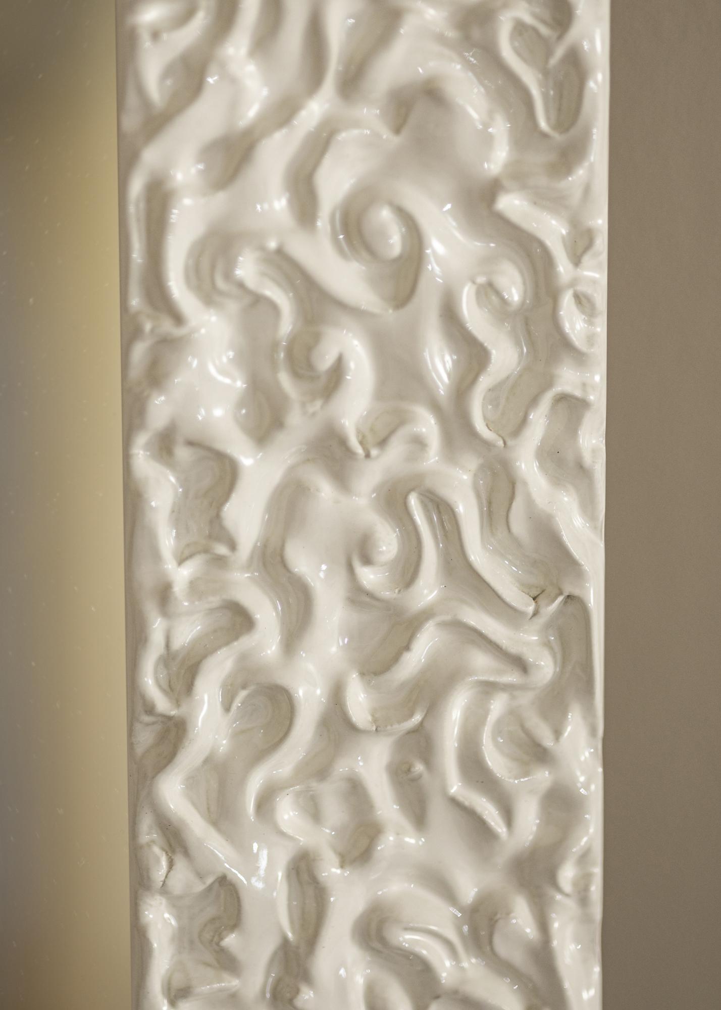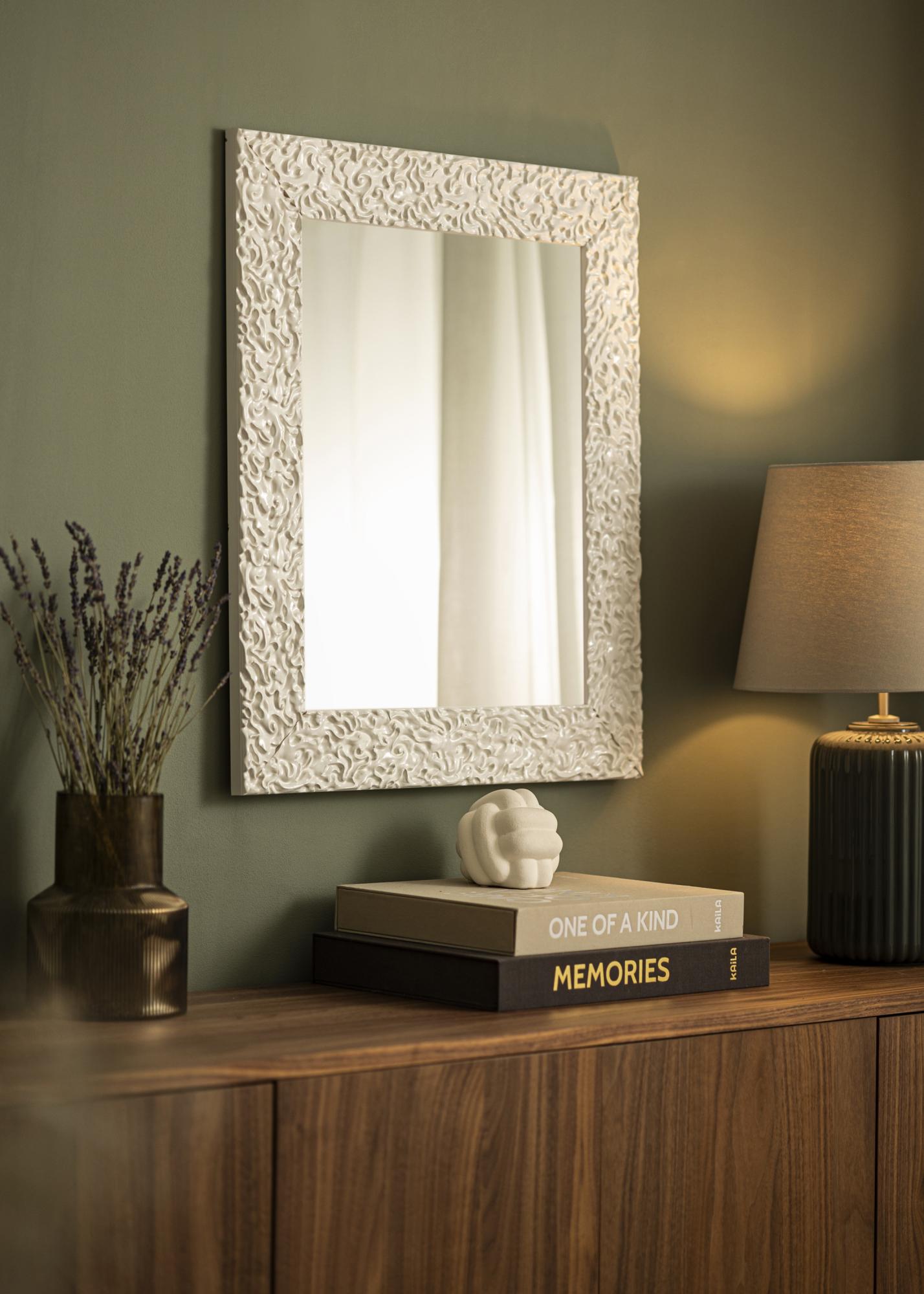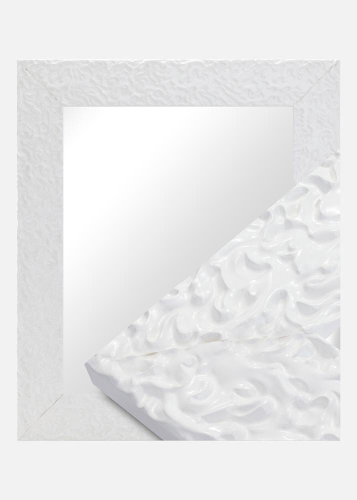 La superficie bianca lucida dello specchio ha un motivo vivace e organico che crea una sensazione moderna ed elegante. Questa finitura brillante accentua le forme morbide e fluide e conferisce alla cornice un'espressione esclusiva. È la soluzione perfetta per te che cerchi un dettaglio accattivante che combina ispirazione classica con un design contemporaneo.