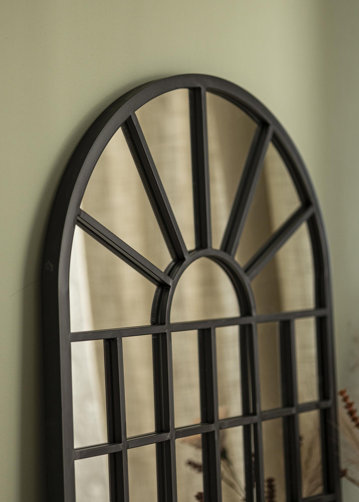 La cornice in metallo nero conferisce allo specchio un tocco distintivo e moderno, mentre la parte superiore curva aggiunge un tocco di eleganza classica. La forma dello specchio ricorda una finestra tradizionale, creando un'illusione di spazio e luce nella stanza. Lo stile industriale è completato dalle listarelle in metallo che dividono la superficie dello specchio, non solo come dettaglio elegante ma anche per contribuire alla robusta struttura dello specchio.