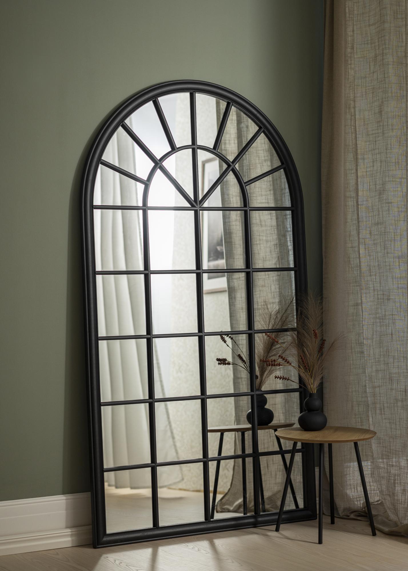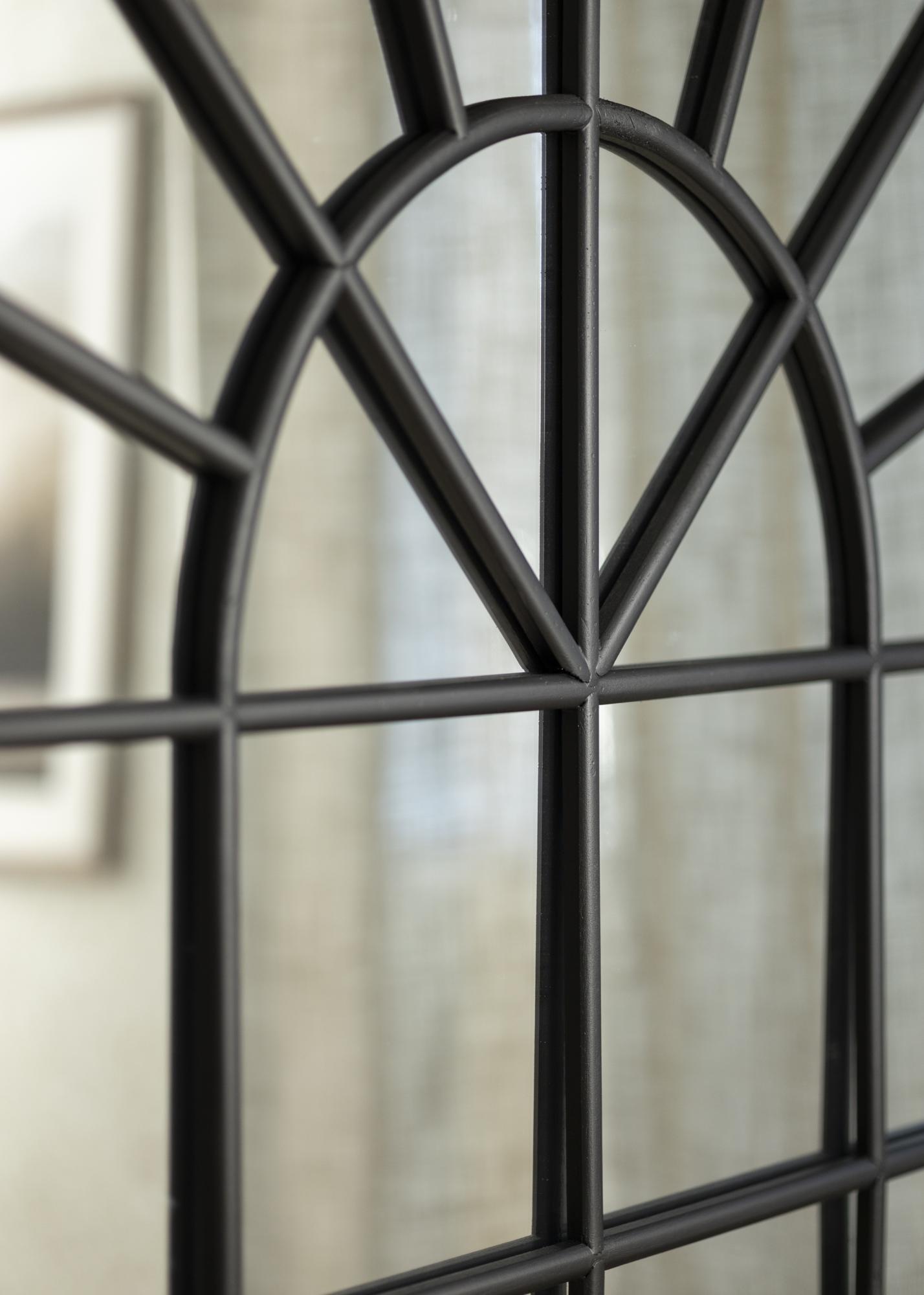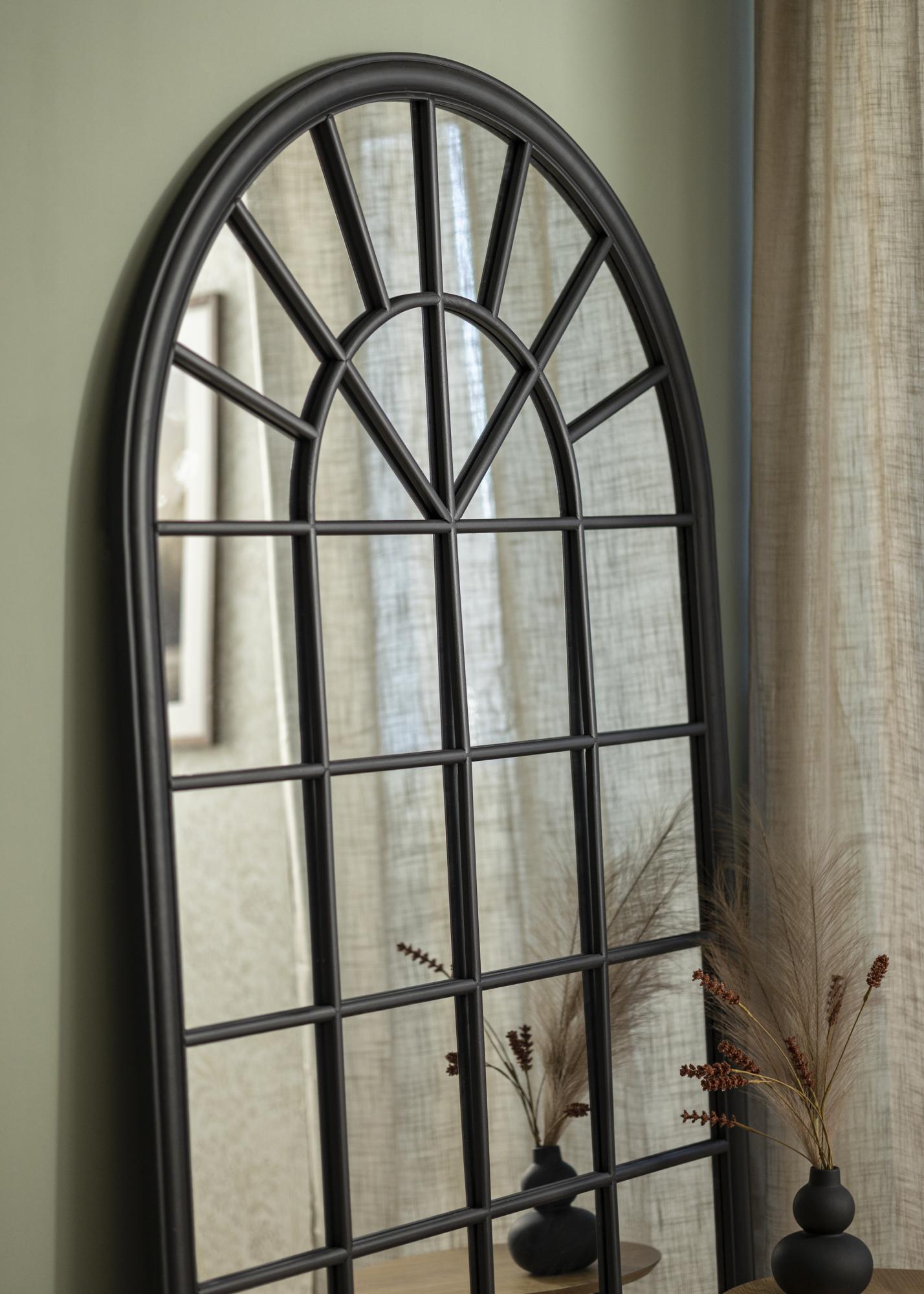 Scopri la presenza maestosa del nostro specchio unico, una vera attrazione per ogni stanza. Con le sue generose misure di 103 x 180 cm, questo specchio non offre solo una funzione pratica ma diventa anche parte della tua decorazione. La sua impressionante forma a mezzaluna superiore è completata da una suggestiva griglia simile a una finestra che conferisce allo specchio un'estetica industriale distintiva.