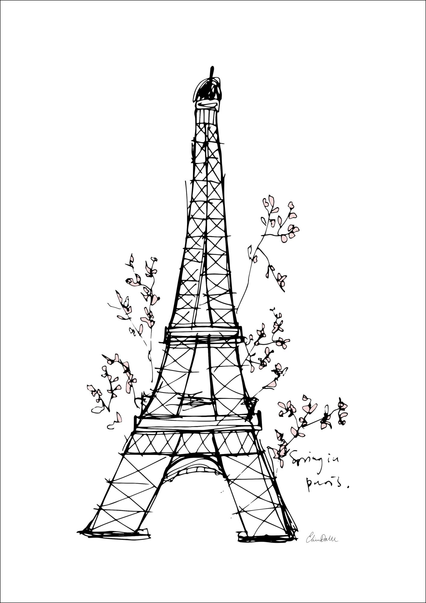Un poster con un semplice disegno a inchiostro della Torre Eiffel. Le linee graffiate nell'immagine e la posizione irregolare della torre al centro contribuiscono a conferirgli una qualità illustrativa. Grandi rami fioriti si estendono dietro la torre per dare quella sensazione di primavera a Parigi.
