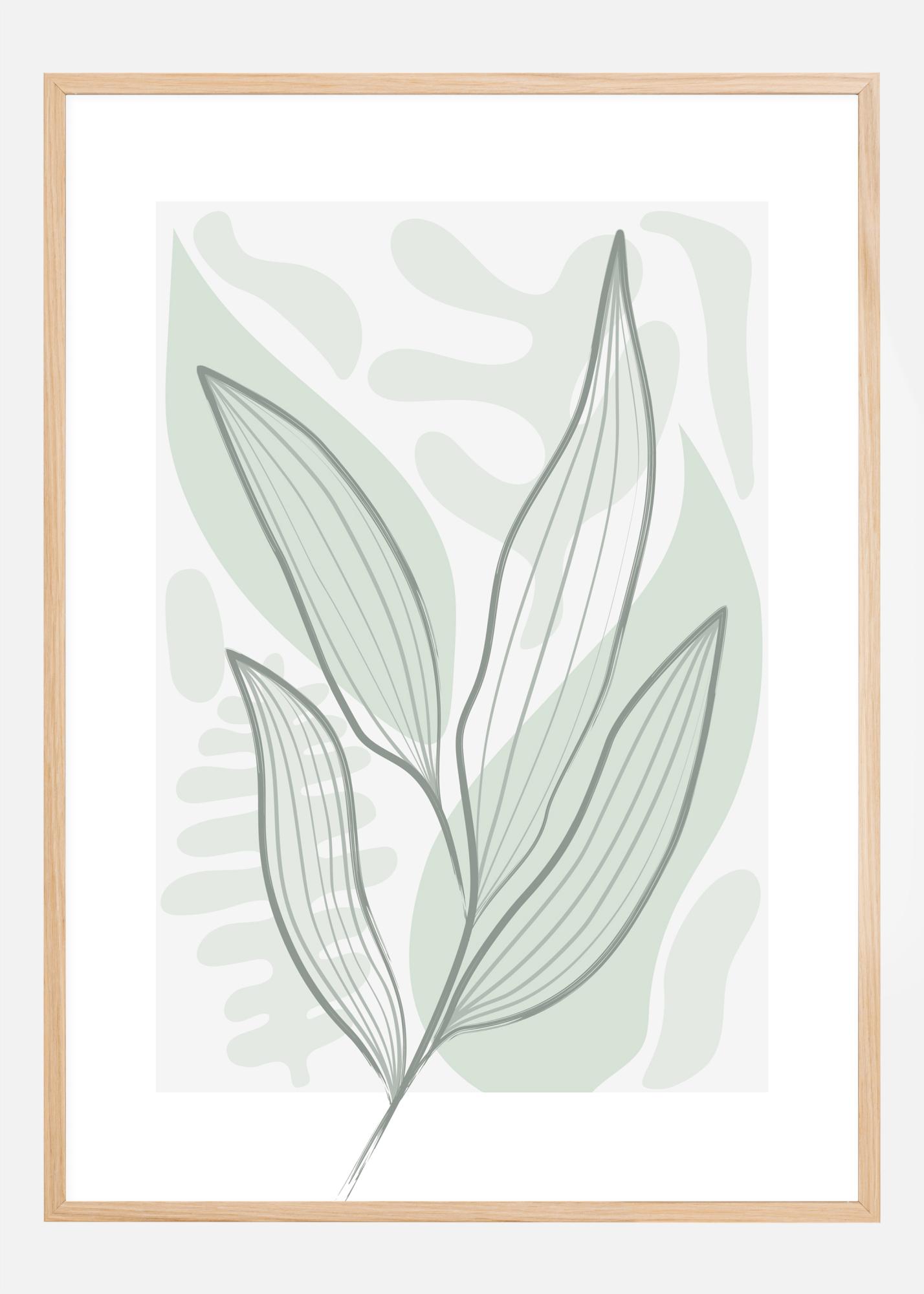 Un poster astratto con foglie su uno sfondo verde semplice con diverse forme e pattern di foglie. Con colori verdi e grigi morbidi, il design semplice delle foglie, delimitato da una forte linea grigia, dà una sensazione di primavera forte ma delicata che può essere appesa in qualsiasi stanza della casa.