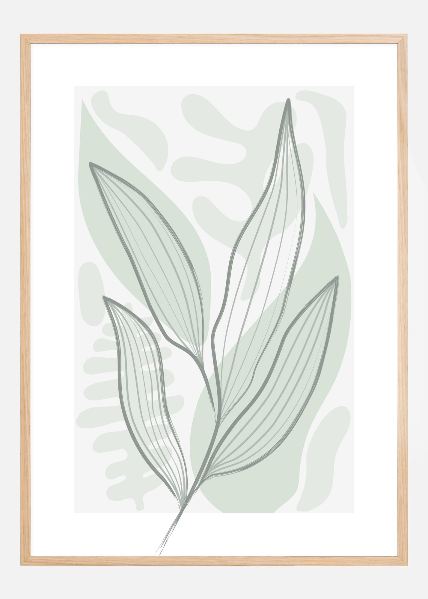 Un poster astratto con foglie su uno sfondo verde semplice con diverse forme e pattern di foglie. Con colori verdi e grigi morbidi, il design semplice delle foglie, delimitato da una forte linea grigia, dà una sensazione di primavera forte ma delicata che può essere appesa in qualsiasi stanza della casa.