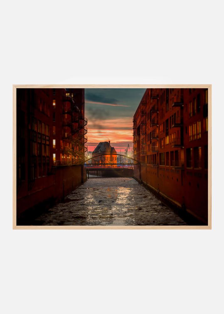 Tramonto sul vecchio quartiere dei magazzini Speicherstadt ad Amburgo, con i suoi canali e gli edifici in mattoni neogotici. La fotografia di questa area protetta è perfetta per gli appassionati di architettura o storia. Il poster si adatta meglio in una cornice sottile in metallo che si abbina all'architettura rigorosa e diventa bello appeso al muro insieme ad altre immagini della città.