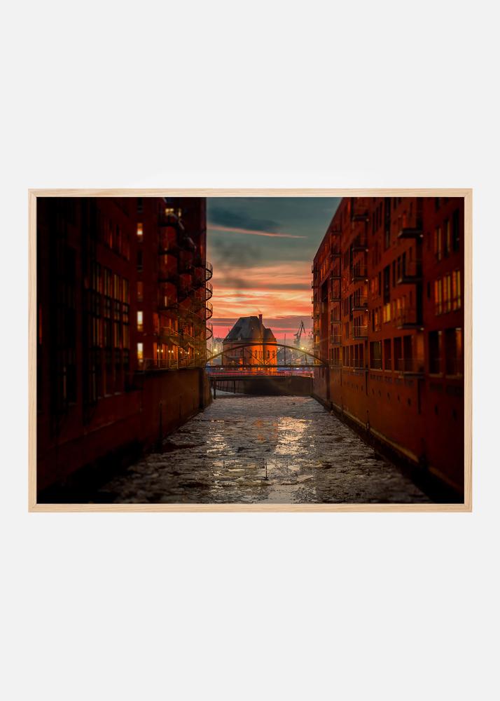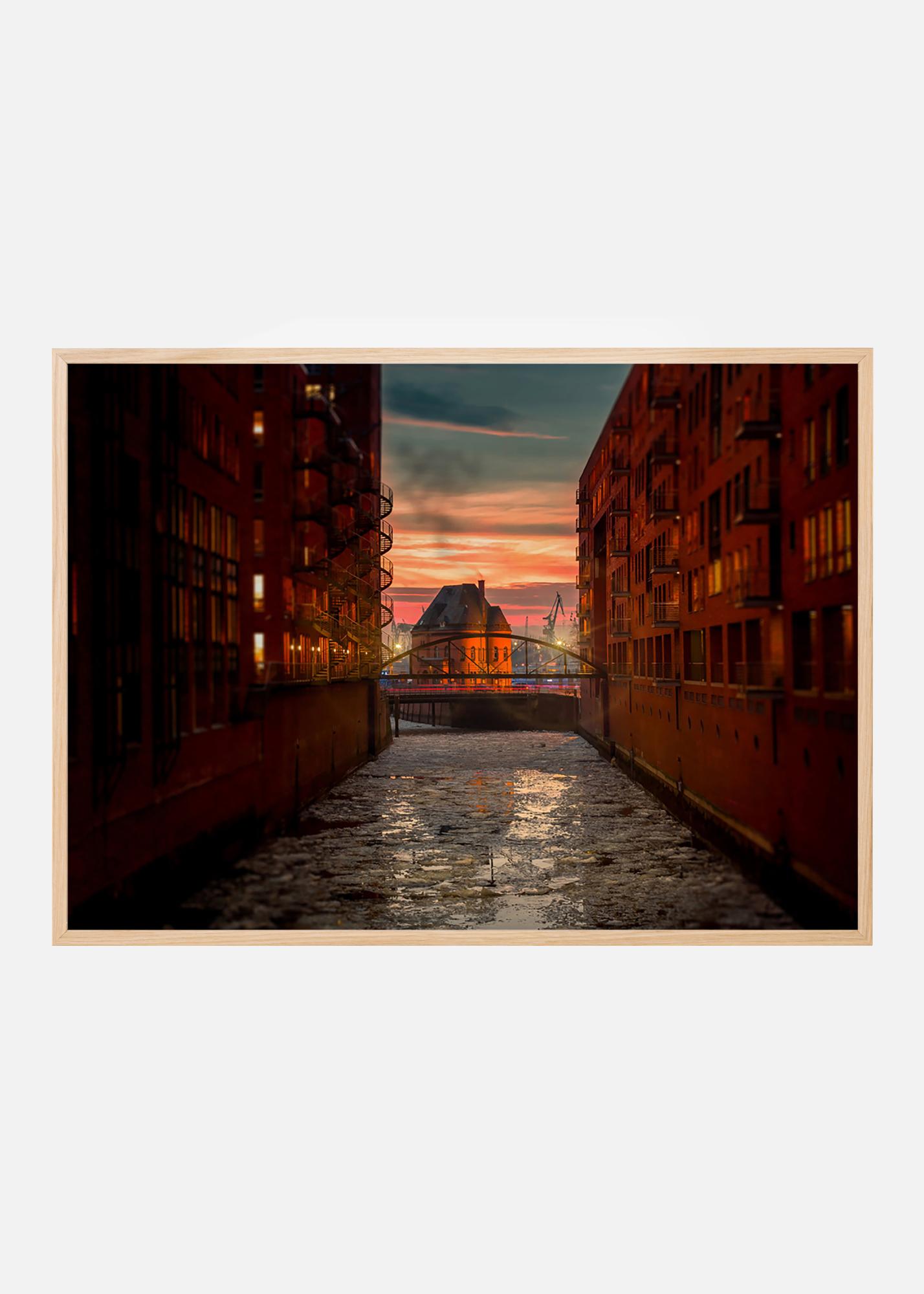 Tramonto sul vecchio quartiere dei magazzini Speicherstadt ad Amburgo, con i suoi canali e gli edifici in mattoni neogotici. La fotografia di questa area protetta è perfetta per gli appassionati di architettura o storia. Il poster si adatta meglio in una cornice sottile in metallo che si abbina all'architettura rigorosa e diventa bello appeso al muro insieme ad altre immagini della città.