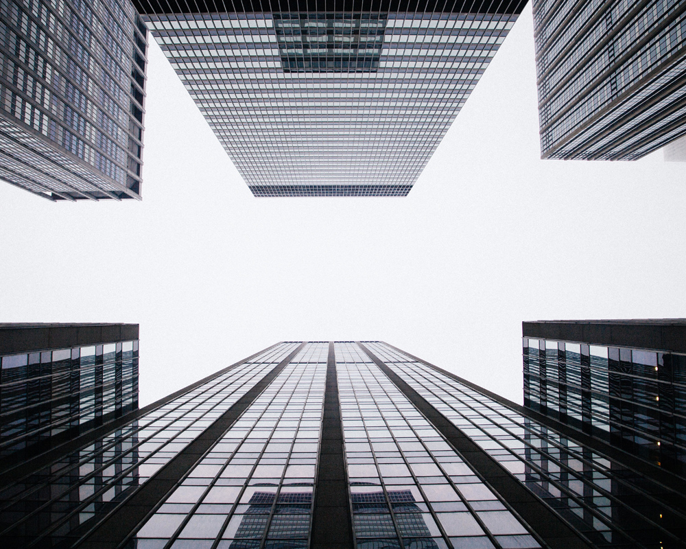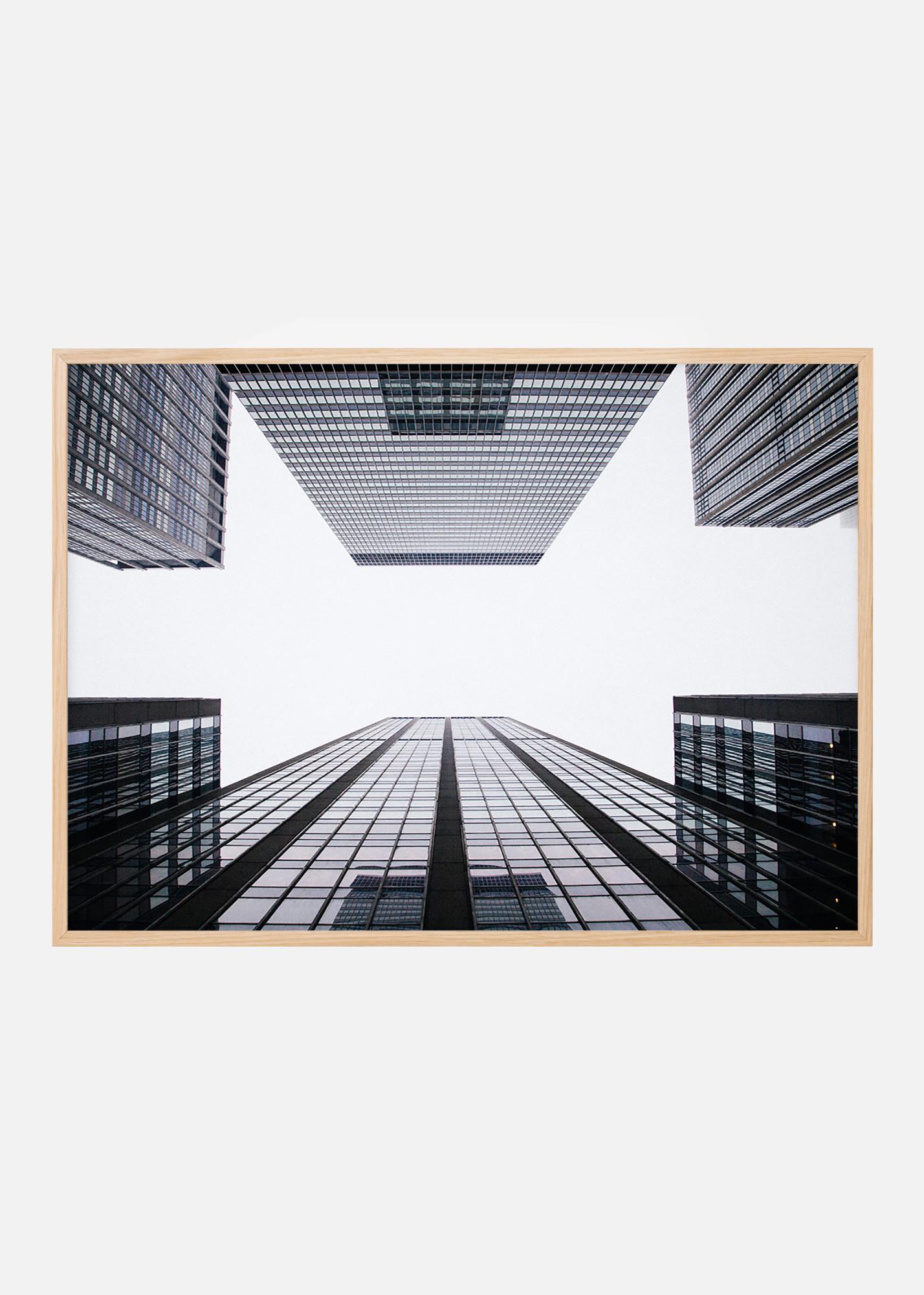 Poster di architettura con grattacieli contro un cielo nuvoloso. Immagine elegante di edifici scuri su uno sfondo bianco, con riflessi del cielo sulle finestre. Regalo perfetto per chi ama i ritratti di edifici. La stampa si presenta bene in una cornice nera che enfatizza il lato scuro dell'immagine e si abbina bene ad altre fotografie di architettura.