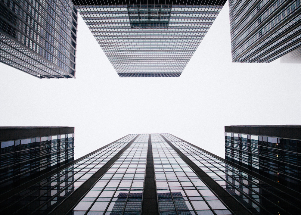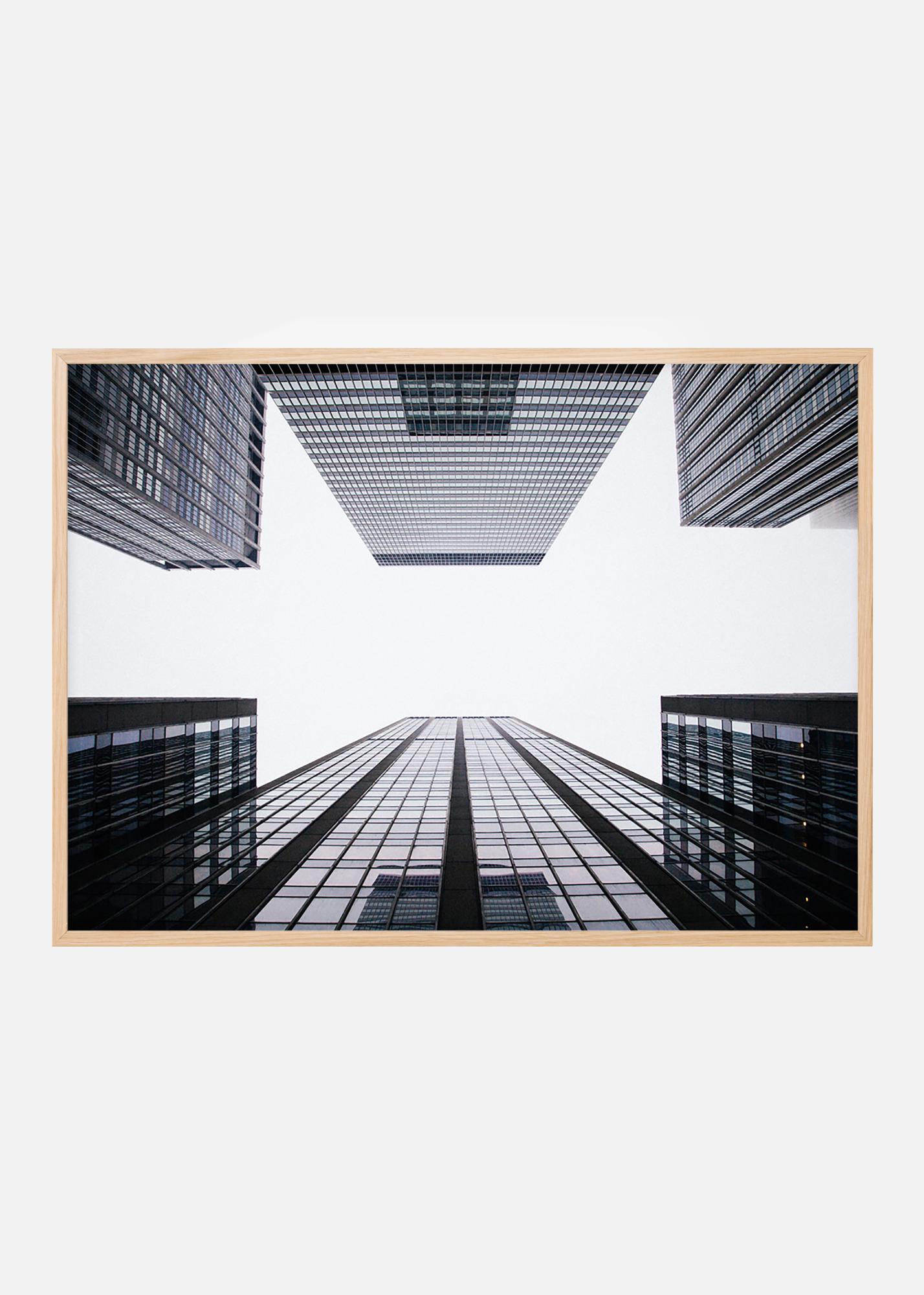 Poster di architettura con grattacieli contro un cielo nuvoloso. Immagine elegante di edifici scuri su uno sfondo bianco, con riflessi del cielo sulle finestre. Regalo perfetto per chi ama i ritratti di edifici. La stampa si presenta bene in una cornice nera che enfatizza il lato scuro dell'immagine e si abbina bene ad altre fotografie di architettura.