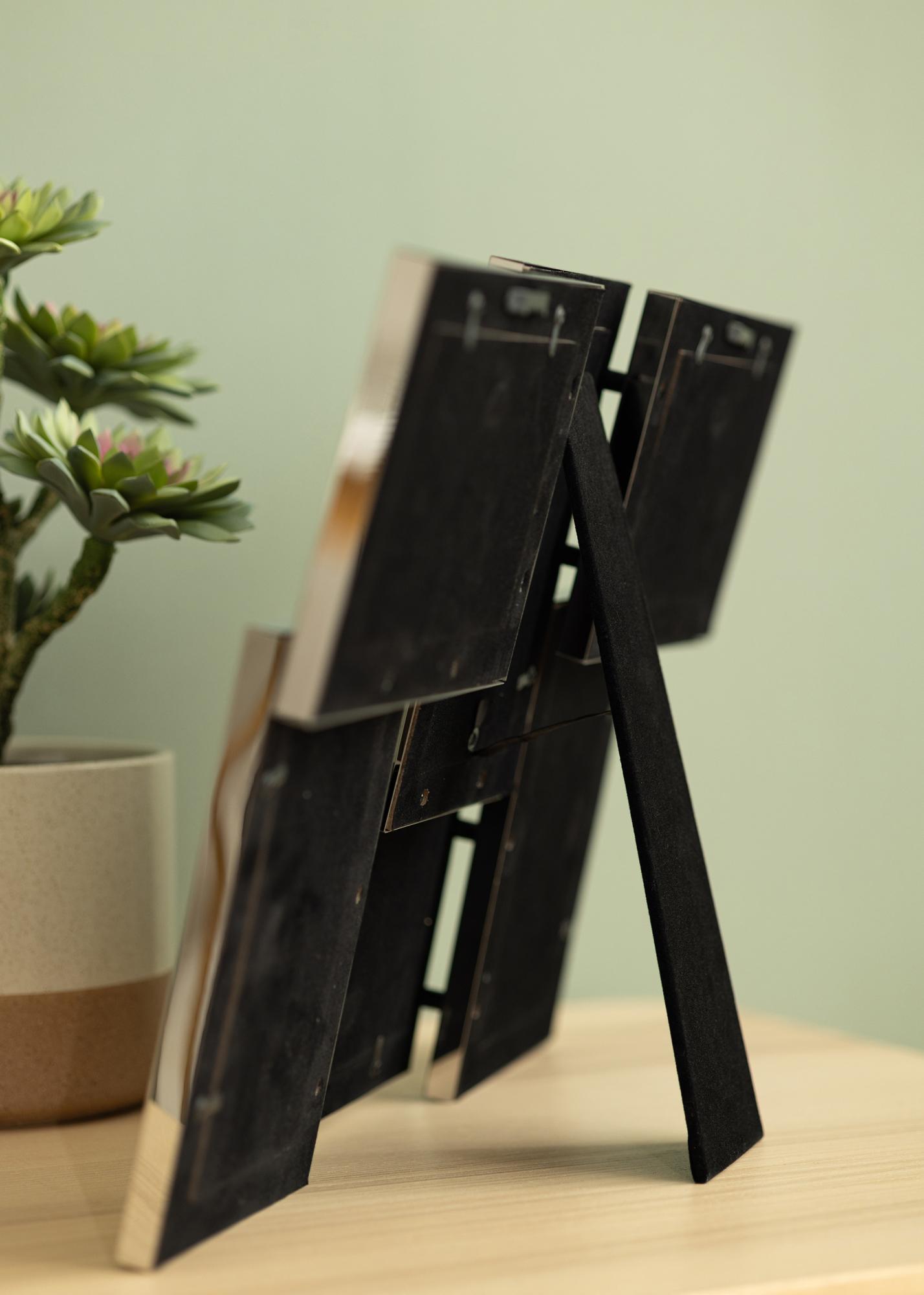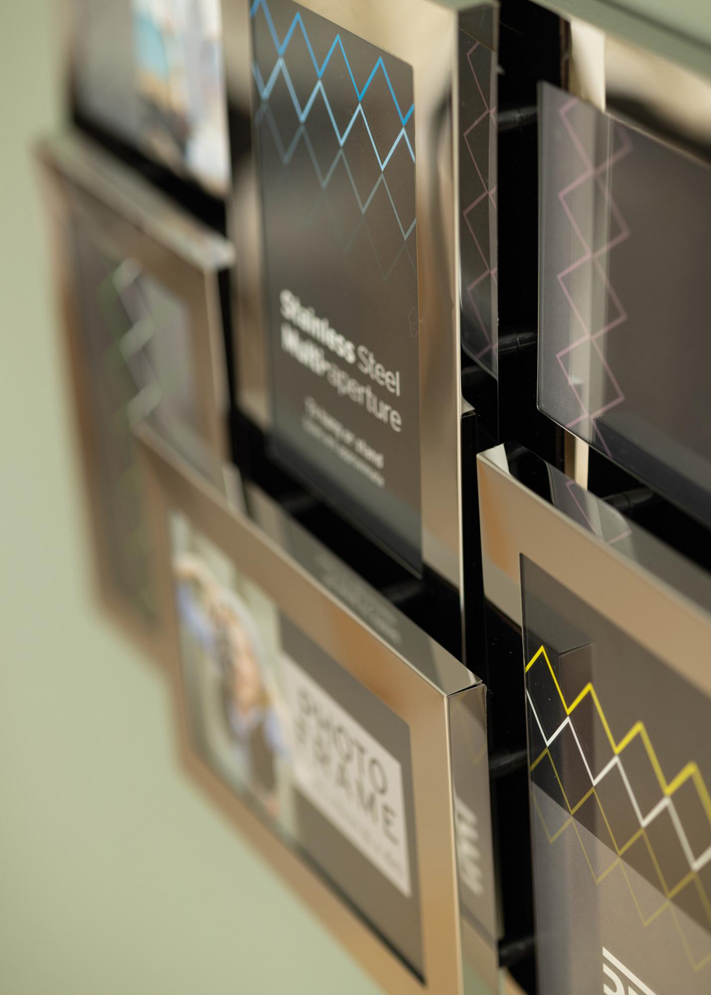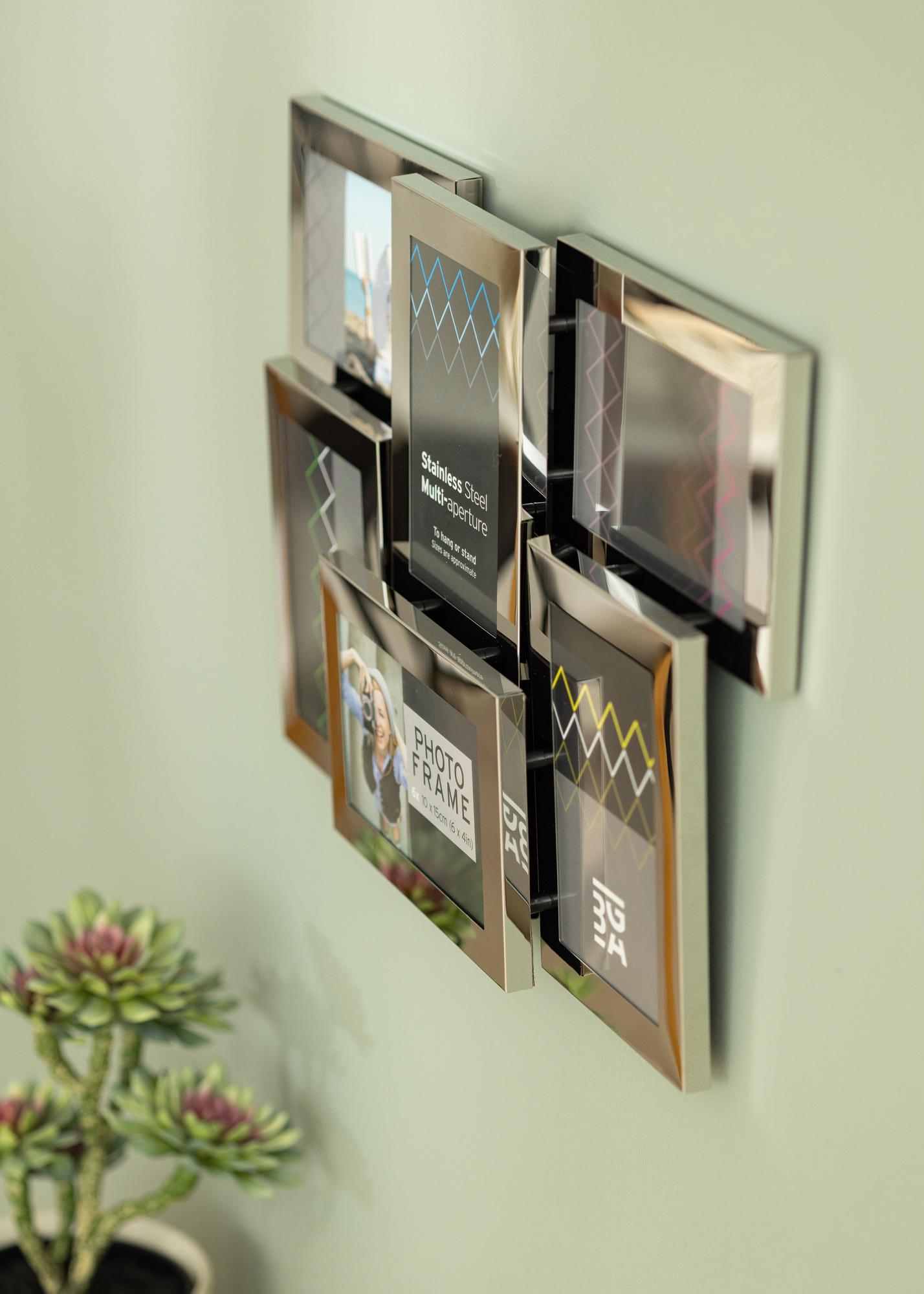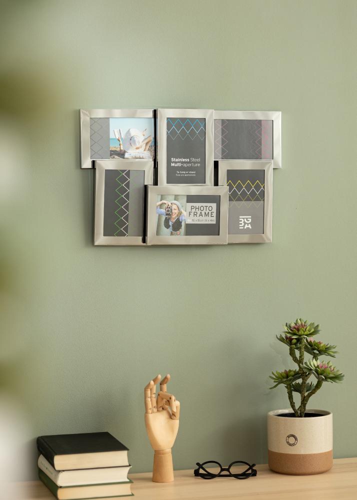 Questa è una cornice multipla per 6 foto di dimensioni 10x15 cm. La cornice ha un aspetto moderno, grazie al materiale robusto in metallo e al colore argento lucido. Puoi scegliere se montare la cornice a parete o posizionarla in verticale su una mensola o sul davanzale della finestra.
