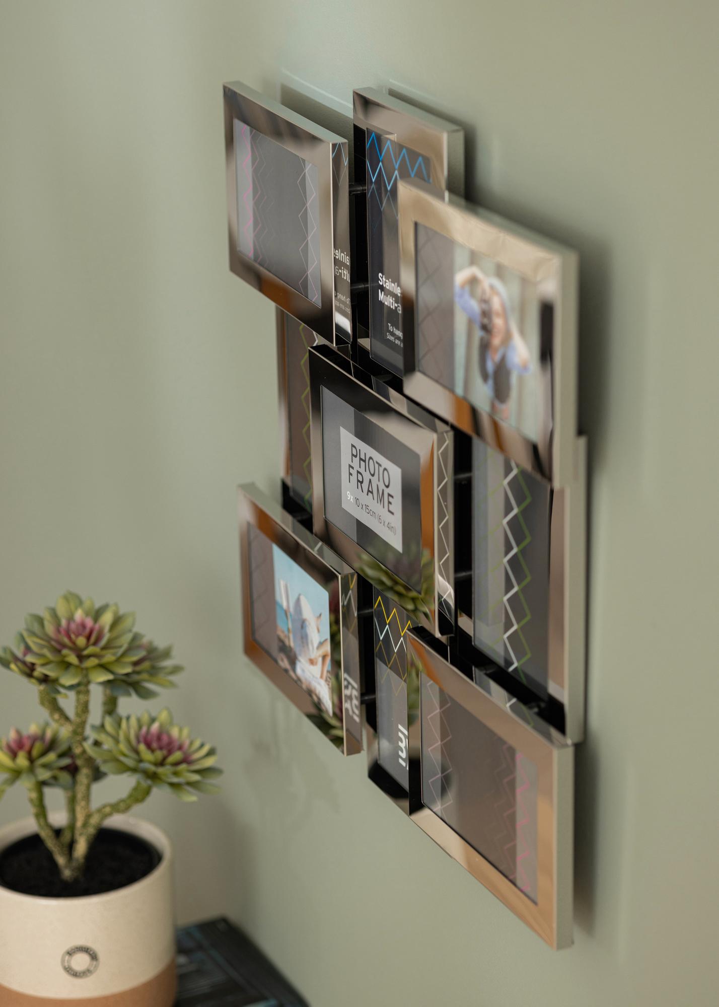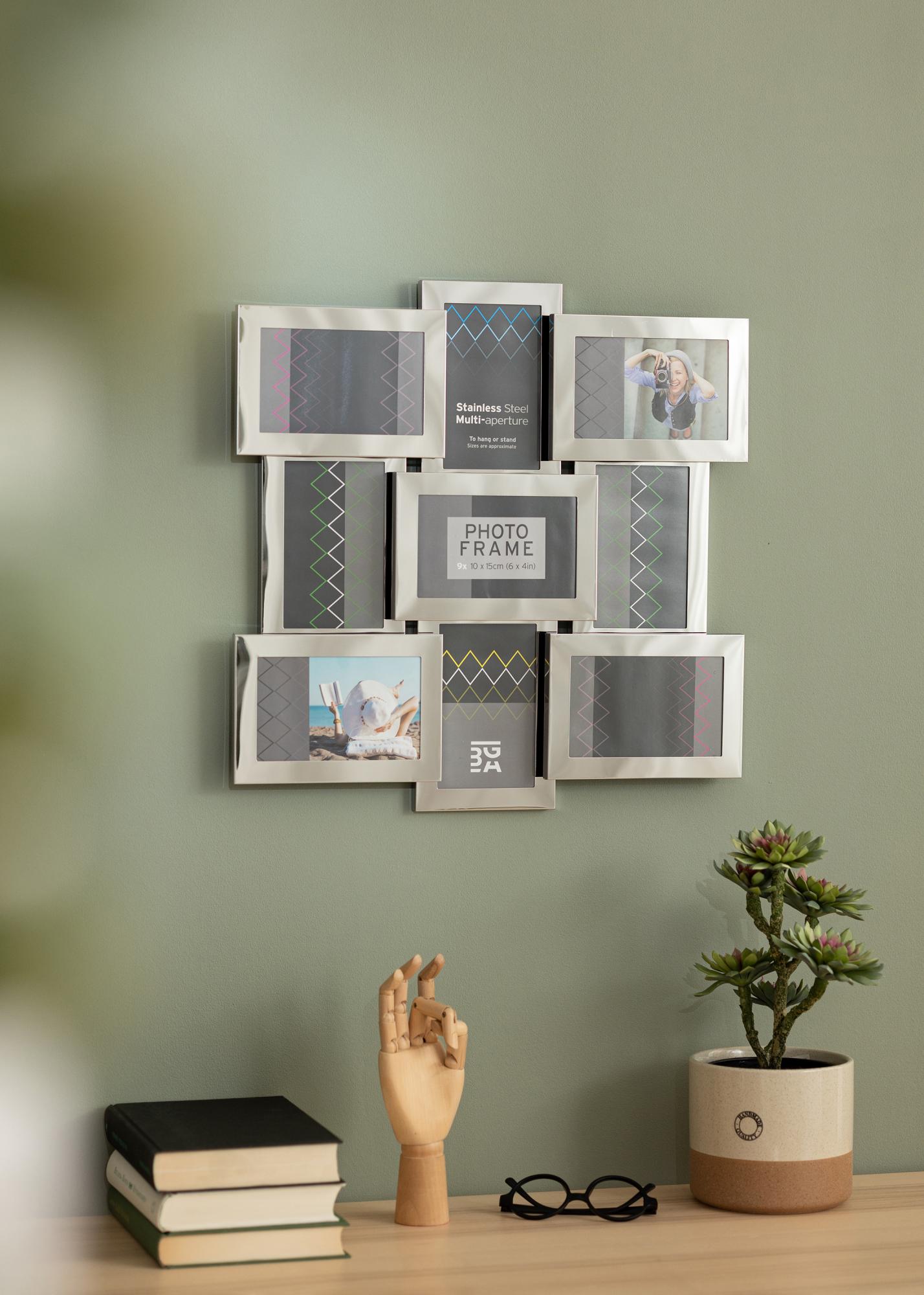 Una cornice d'argento in metallo dona ad ogni casa un tocco moderno. Il materiale ha una finitura lucida che riflette la luce dalle lampade vicine. Inoltre, questa cornice può contenere ben 9 foto di dimensioni 10x15 cm. Ciò ti offre molto spazio per mostrare foto di famiglia, immagini delle vacanze e altri motivi che ti piacciono, tutto in una sola cornice.