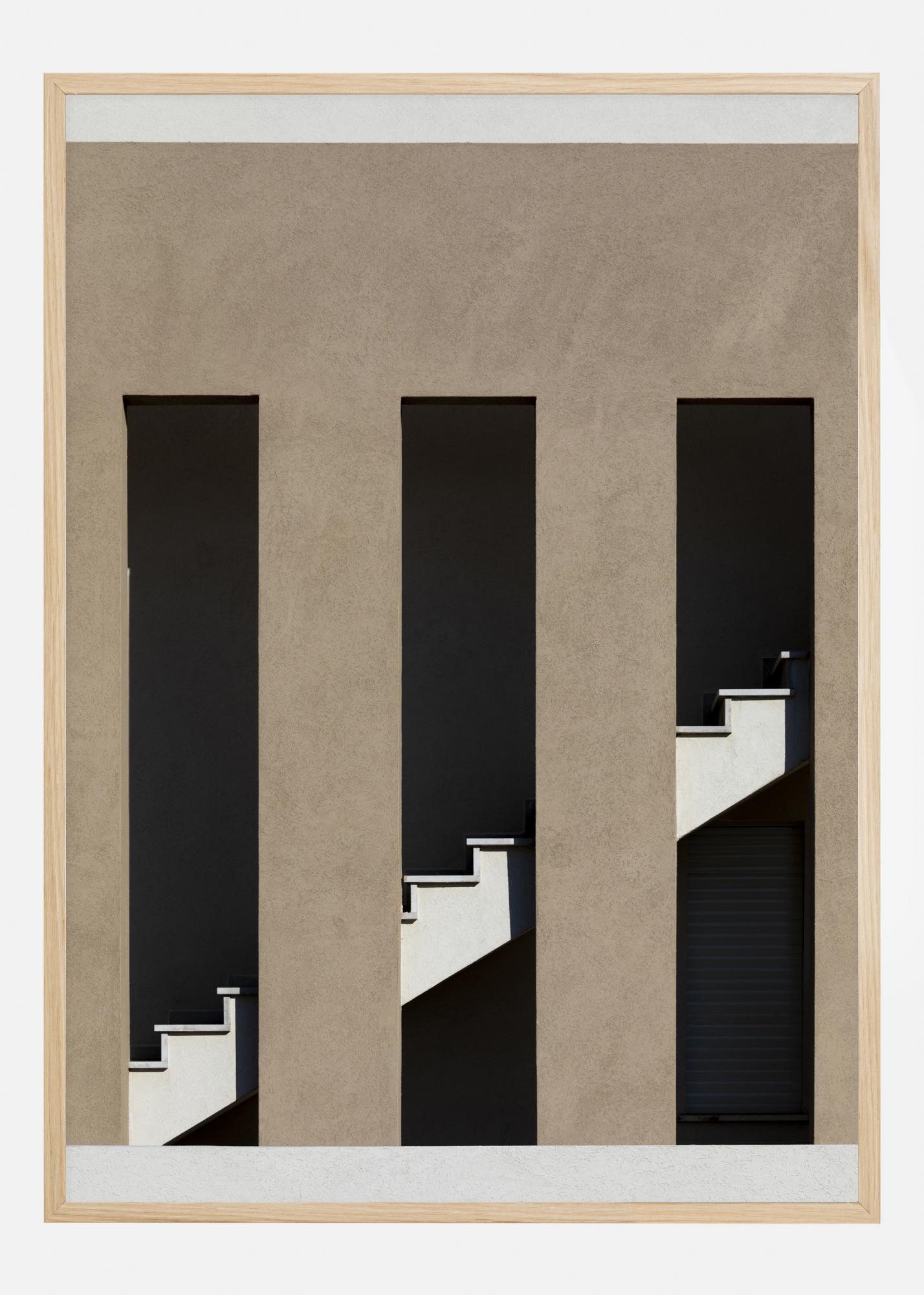 Un poster in ambiente urbano con scale che si innalzano dietro grandi aperture finestre. Un'immagine astratta fantastica, dove le forme geometriche creano una sensazione di ordine in questa immagine drammatica. Questa immagine dona alla tua casa un tocco d'arte.