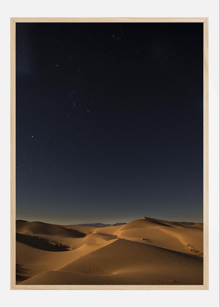 Un suggestivo poster con il deserto di notte. Morbide dune di sabbia giallo dorato si estendono lontano in basso nell'immagine. Sopra la sabbia si estende un'enorme cielo blu scuro con morbide stelle sparse su di esso. Crea una sensazione di spazio quando appendi questo poster a casa.
