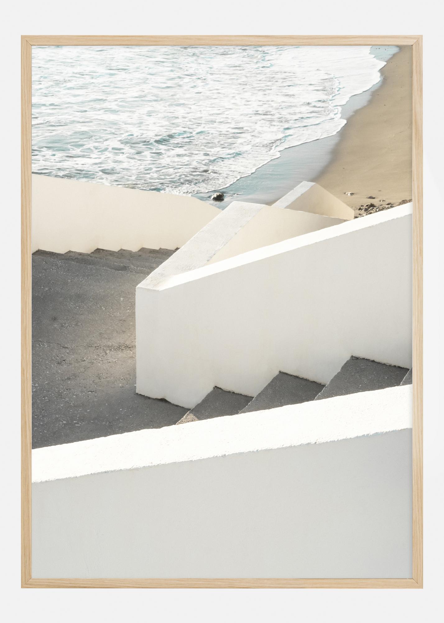 Questo poster offre una sensazione sia di architettura che di natura mostrando una struttura con gradini bianchi che conduce a una tranquilla spiaggia e al calmo mare. Il gioco tra luci e ombre sui gradini, insieme al contrasto tra l'architettura rigorosa e la morbida linea della spiaggia, crea un'immagine che è sia rilassante che visivamente interessante.