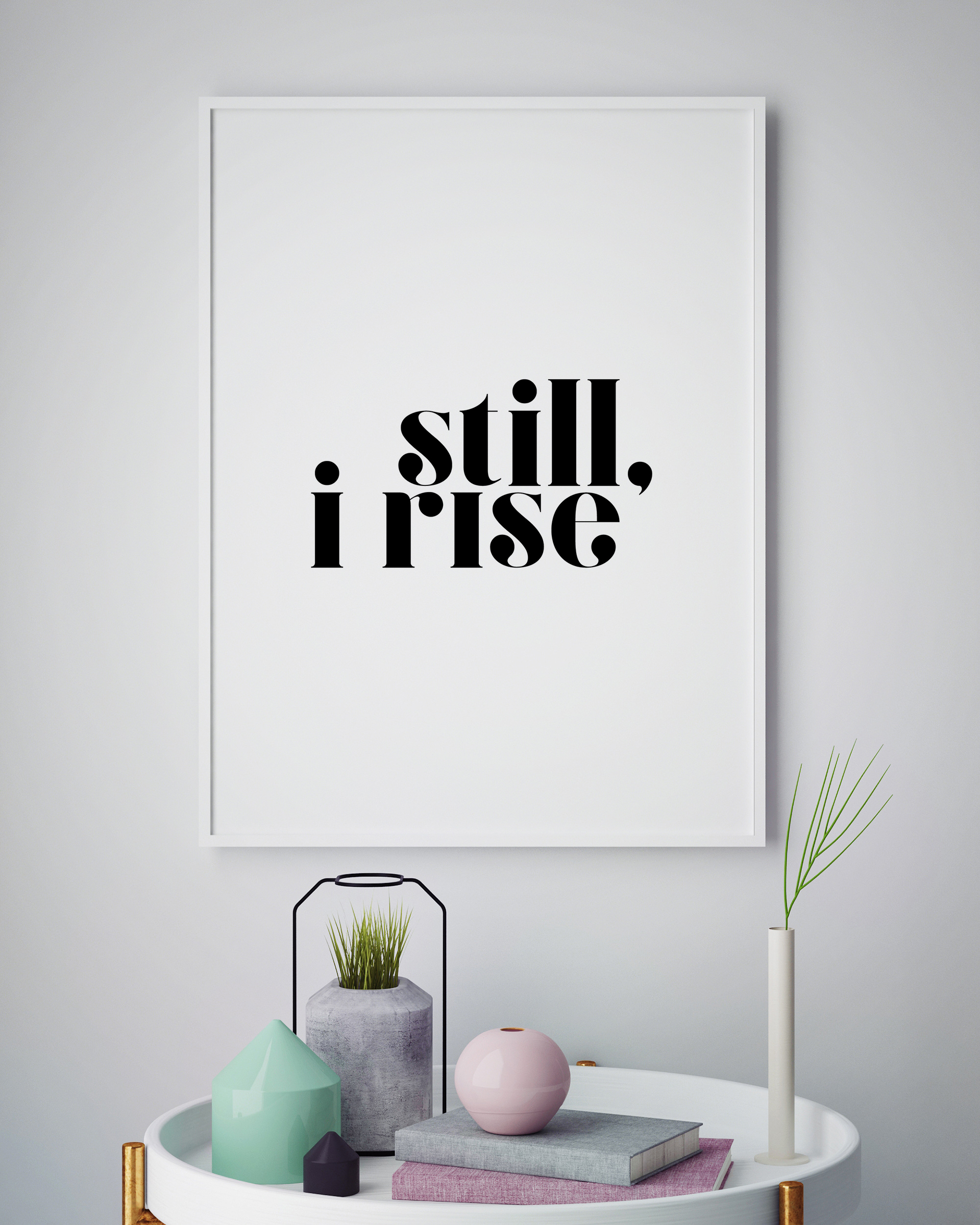 Un poster di ispirazione con una citazione di conferma quotidiana in caratteri neri audaci su uno sfondo bianco normale. Concediti la forza di andare avanti con la frase "Still, I Rise", mentre bevi il tuo caffè al mattino e pianifichi la tua giornata.