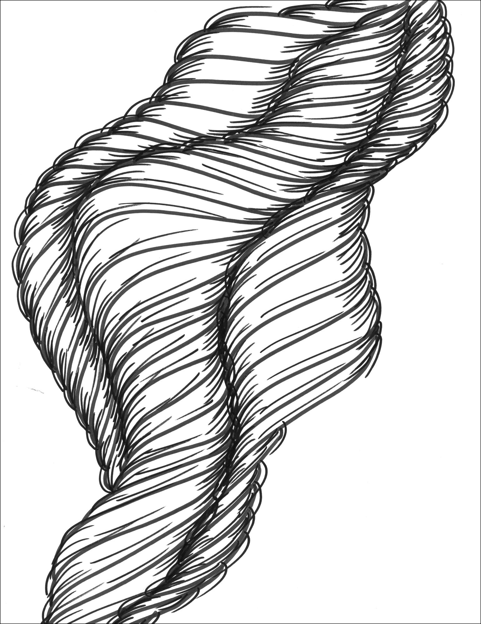 Un poster astratto vorticoso con linee nere che si intrecciano per creare la forma di un tornado. Tre spirali di linee nere si avvolgono su uno sfondo bianco. Le linee spesse e sottili creano un'immagine quasi in movimento che cattura lo sguardo mentre si muove attraverso l'opera.