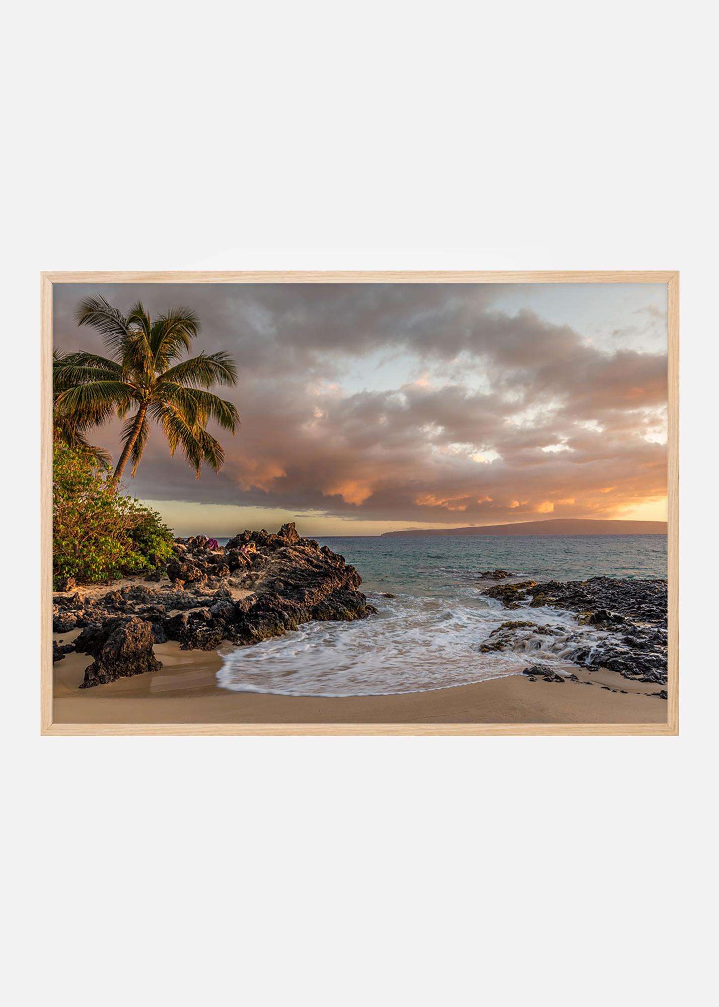 Una spiaggia al tramonto, un cliché bellissimo che è un must per gli amanti del tiki o del tema tropicale. Poster con la classica palma che si protende oltre il bordo della spiaggia negli ultimi raggi dorati del sole. La fotografia sarà bella in una cornice dal look consumato dal tempo o in un colore vivace per abbinarsi all'arredamento tiki.