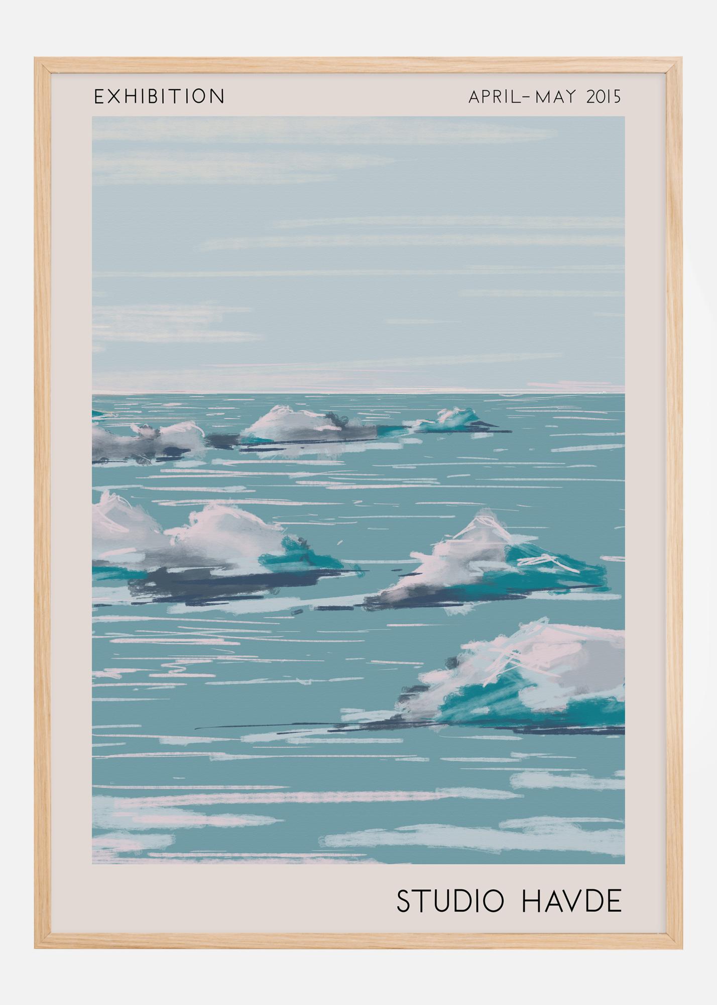 Questo poster pacifico e suggestivo dalla mostra di Studio Havde di aprile-maggio 2015 trasmette una forte sensazione della natura mutevole e potente del mare. L'opera raffigura una serie di iceberg che si fanno strada attraverso la superficie calma del mare, dipinti in una rilassante palette di blu freddi e morbide tonalità bianche che creano una sensazione di freddo e tranquillità nella composizione. Questa scena del paesaggio artico è sia senza tempo che attuale, e riflette la forza indomabile e la bellezza della natura.