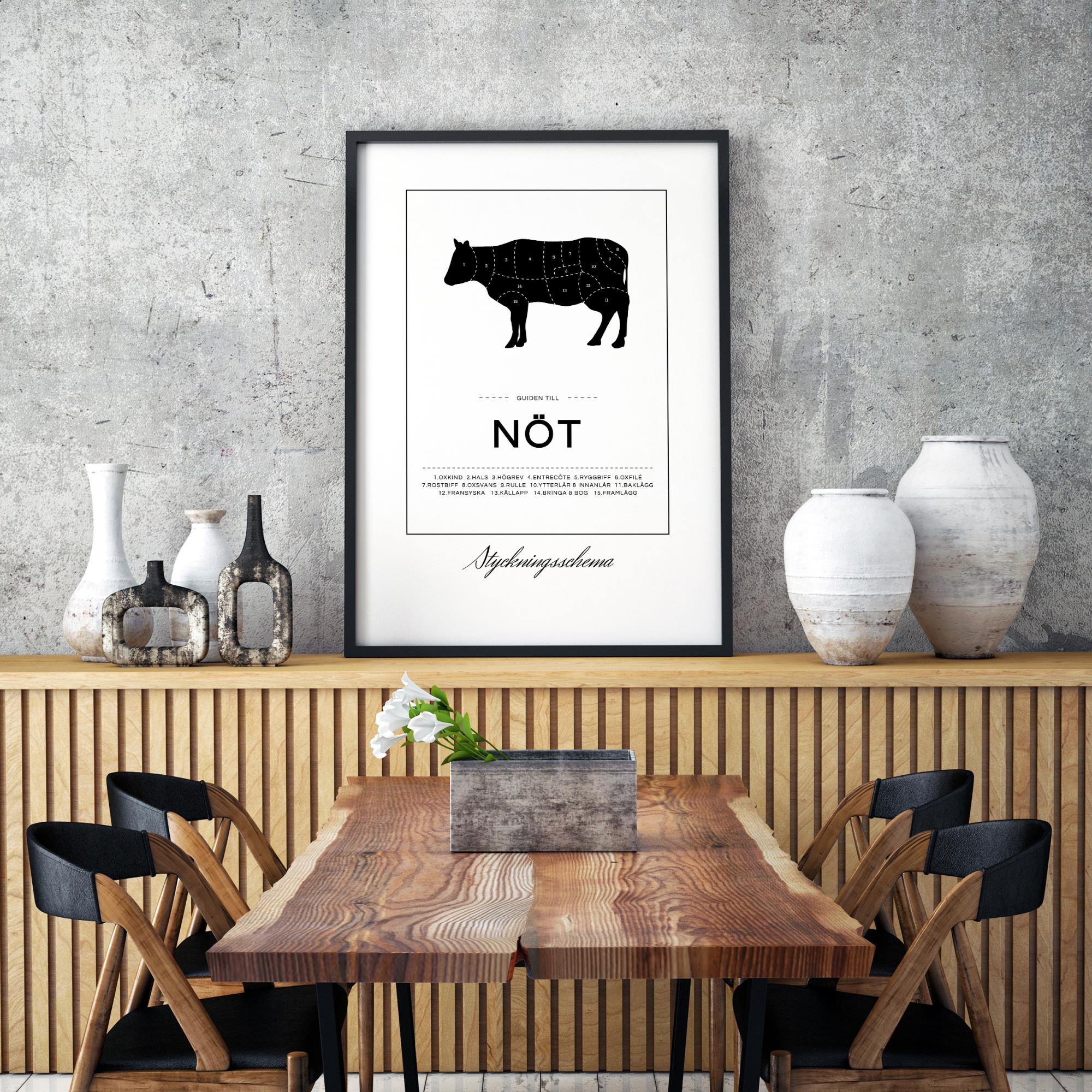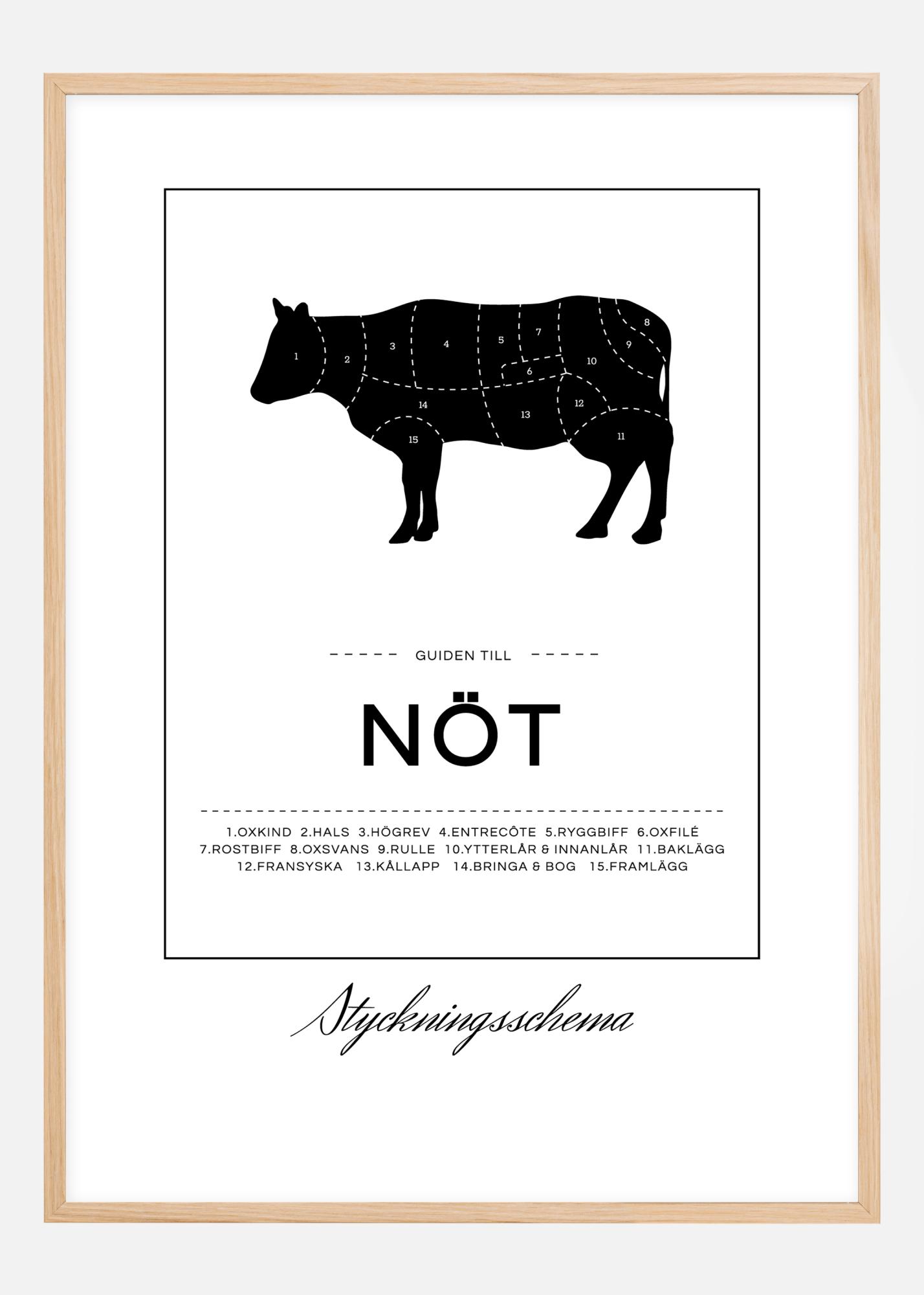 Uno schema di sezionatura non è solo per i macellai professionisti! Questo elegante poster ha un'immagine di una mucca nera divisa in sezioni che mostrano dove prendere ad esempio il roast beef, il rotolo e il controfiletto. Sotto l'immagine c'è il testo "La guida per il manzo" insieme a un elenco numerato delle diverse parti. Intorno all'immagine c'è un sottile rettangolo e sotto il rettangolo c'è una stampa con il testo "Schema di sezionatura". Il design in bianco e nero si abbina perfettamente a una cornice argento o a una cornice nel tuo colore preferito. Il poster è disponibile in diversi formati, quindi puoi facilmente trovare quello adatto alla tua cucina.