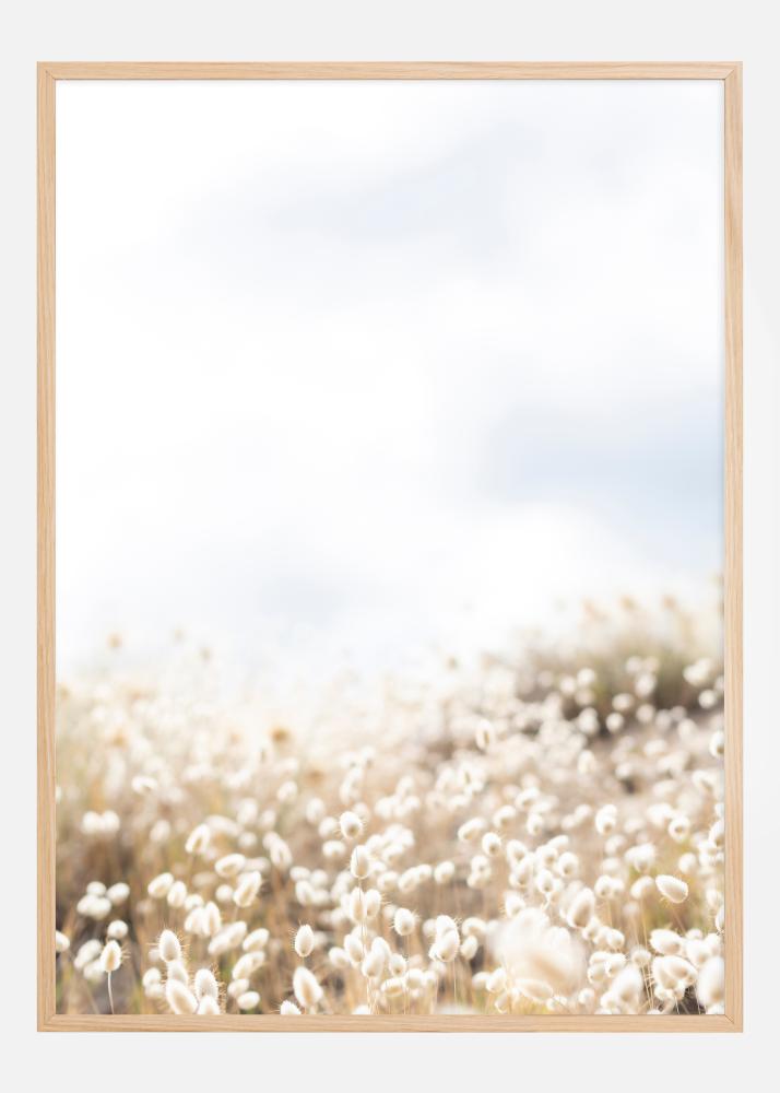 Questo poster da sogno cattura un campo pieno di fiori leggeri e soffici che si bagnano in una luce solare morbida. Il motivo, pieno di natura e tranquillità, trasmette una sensazione di calore e calma. Le delicate teste dei fiori bianchi ondeggiano nella brezza tranquilla, e l'immagine è drappeggiata in tonalità pastello di giallo, beige e bianco che si fondono con il cielo azzurro.