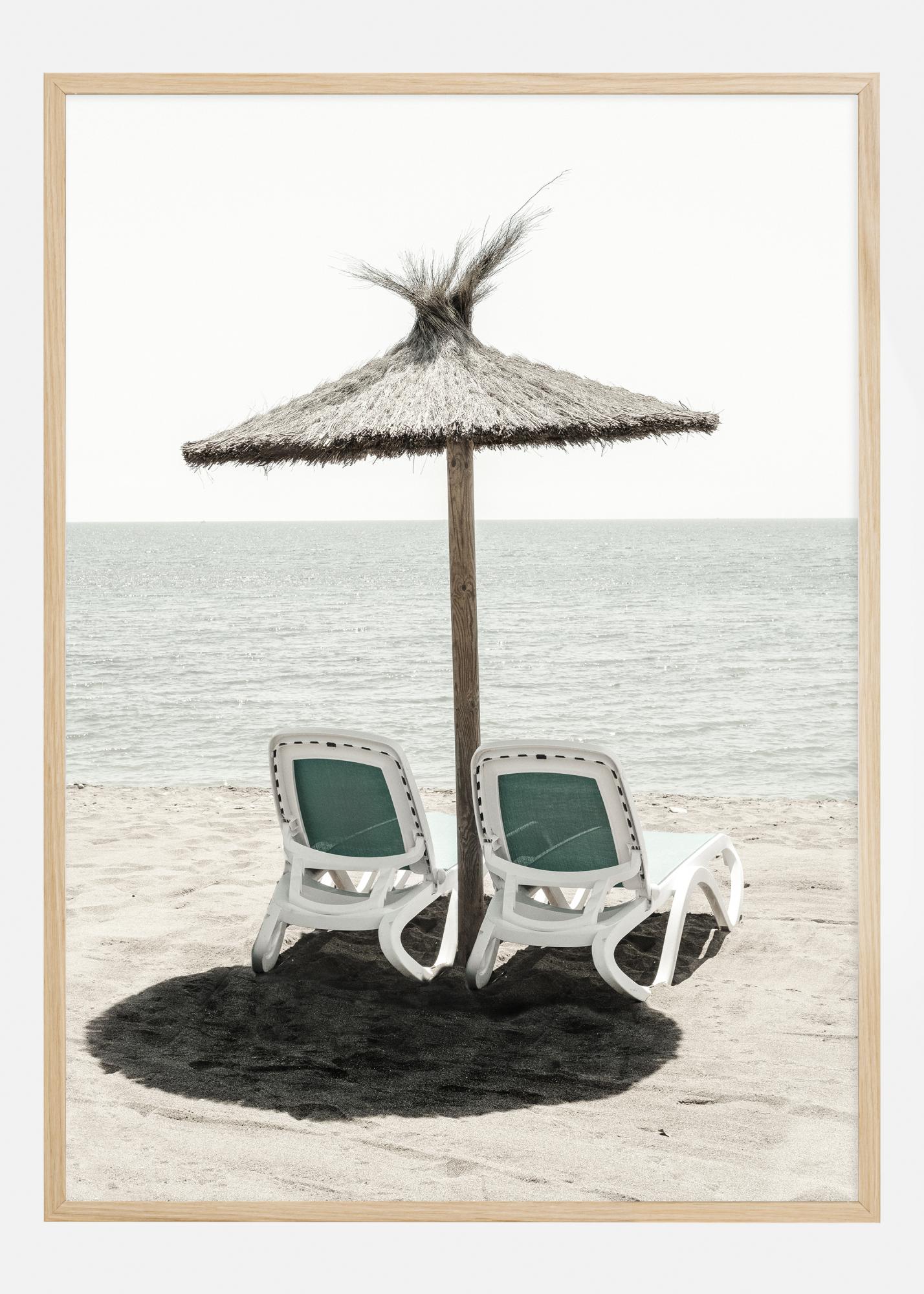 Sogna al suono delle onde e alla sensazione di sabbia riscaldata dal sole con questo poster calmante. Due sedie a sdraio vuote sotto un ombrellone di paglia aspettano invitanti sulla spiaggia, con l'orizzonte del mare sullo sfondo. Questa scena tranquilla è un'espressione di rilassamento e una fuga dalla quotidianità.