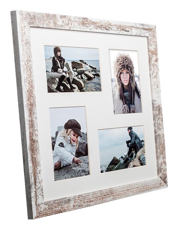 Bellissima cornice vintage con un ampio profilo di cornice dall'aspetto consumato in bianco e legno. Aggiunge una dimensione extra alle tue foto e si adatta perfettamente quando desideri una sensazione autentica di vintage. La cornice multipla ha spazio per 4 foto di dimensioni 10x15 cm.