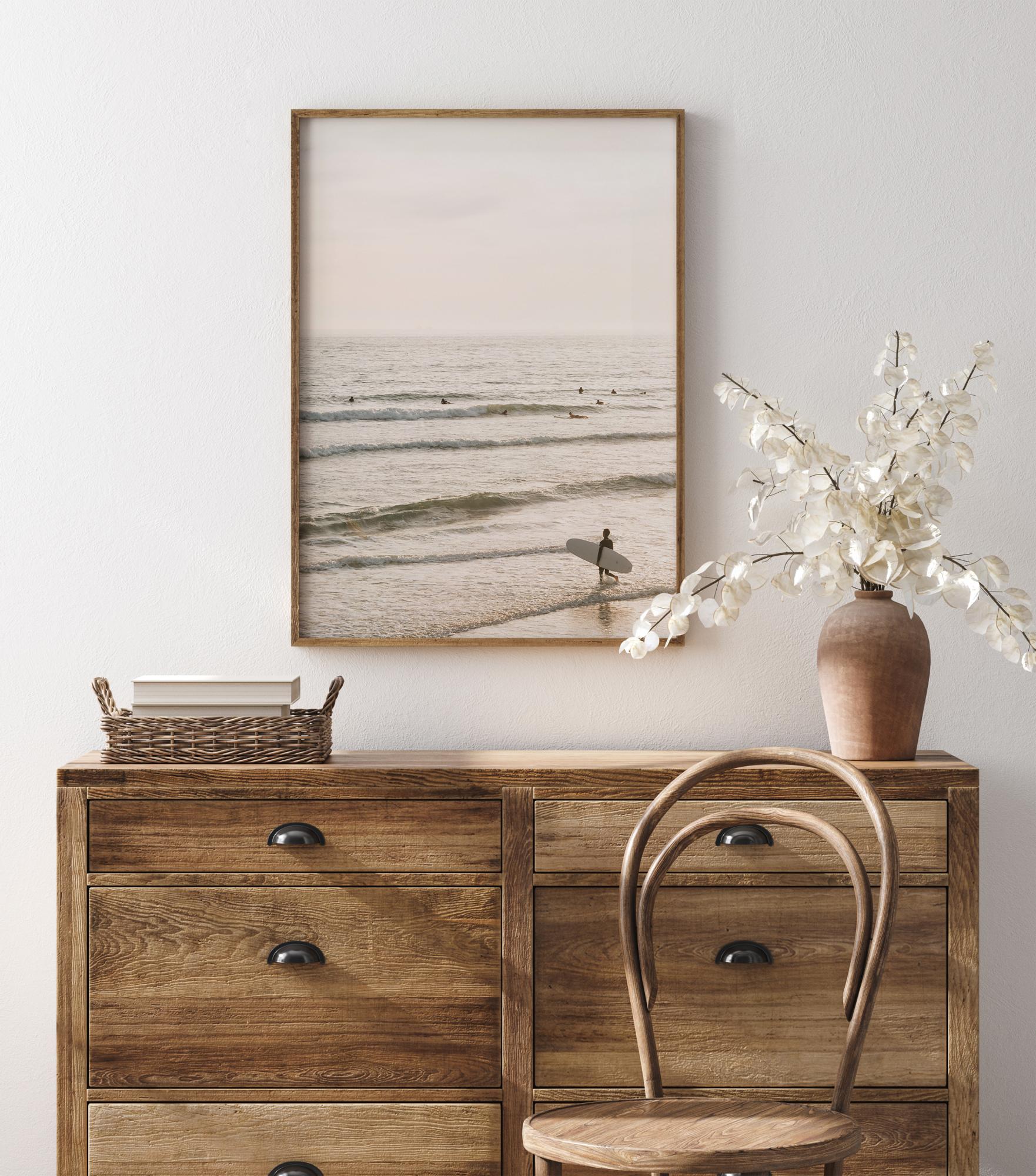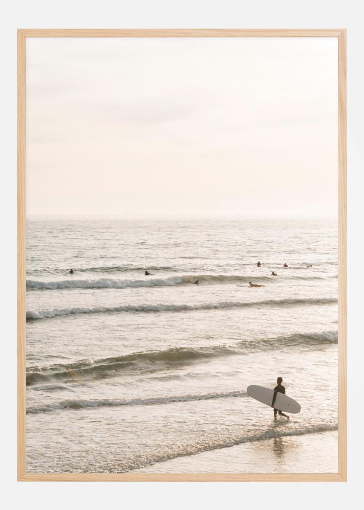 Un poster con un vasto mare pieno di surfisti che aspettano la prossima grande onda. Piccole teste galleggiano lontano in mare e un ultimo surfista cammina tra le onde con la sua tavola. Il mare è calmo nella morbida luce del mattino e c'è un senso di attesa nell'aria.