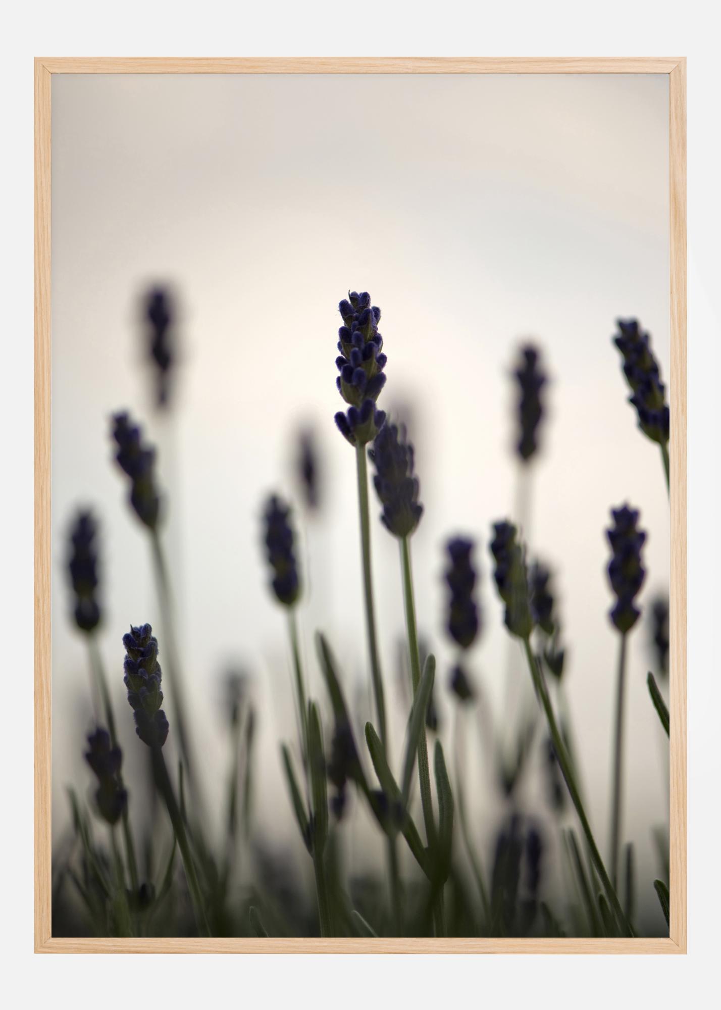 Un poster floreale con un primo piano dei fiori di lavanda in un campo. Se guardi attentamente, puoi vedere i boccioli viola che sventolano in cima ai gambi verdi. Stanno in verticale dritti su uno sfondo bianco semplice, il complemento perfetto per una stanza colorata.