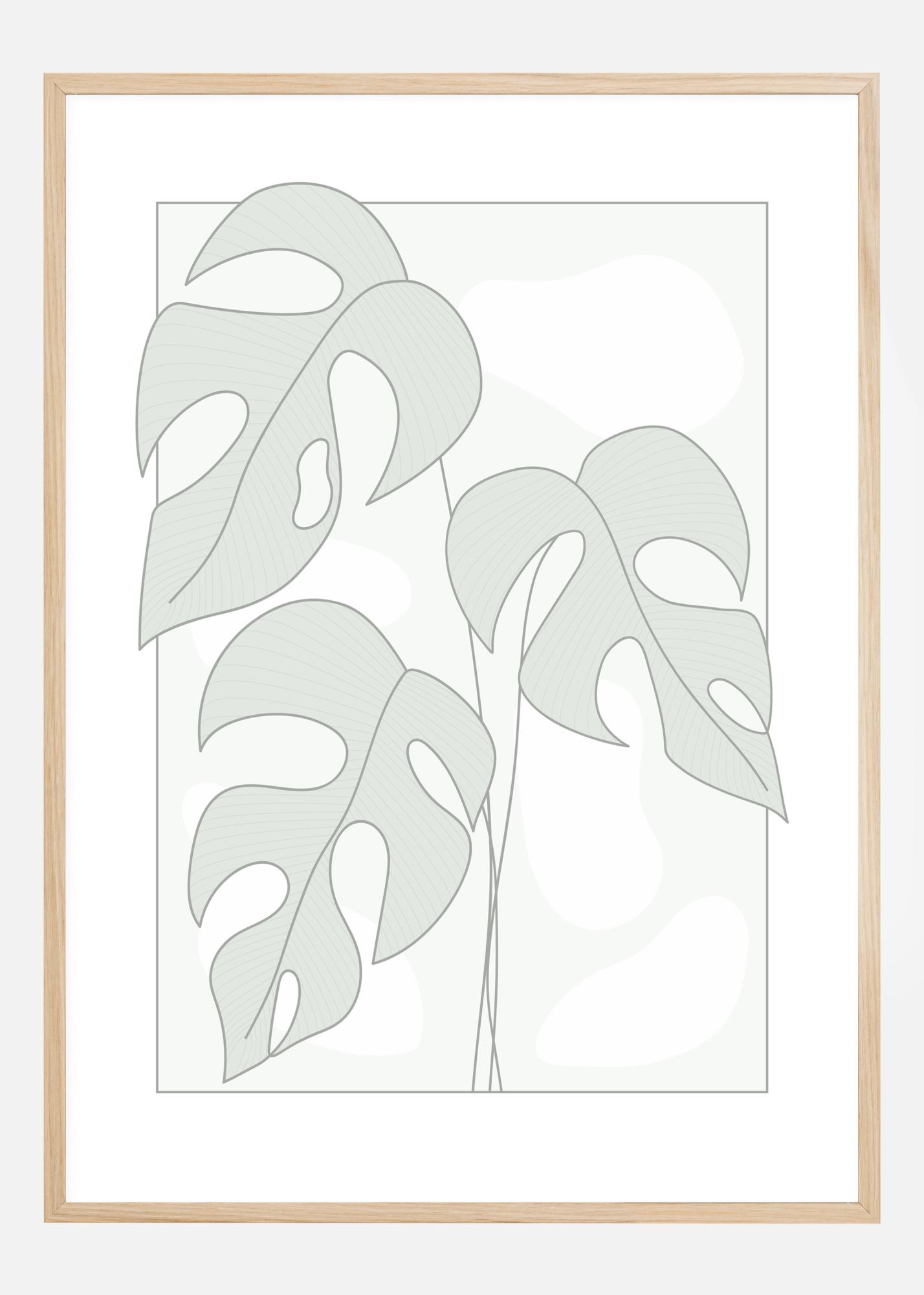 Un semplice poster con illustrazioni di foglie di monstera. Tre grandi foglie riempiono l'immagine, ognuna in una tonalità grigia morbida. Linee più sottili rappresentano i gambi mentre queste eleganti foglie con buchi pendono in questa immagine. Mantienilo discreto appendendolo su una parete verde morbida per una sensazione naturale.