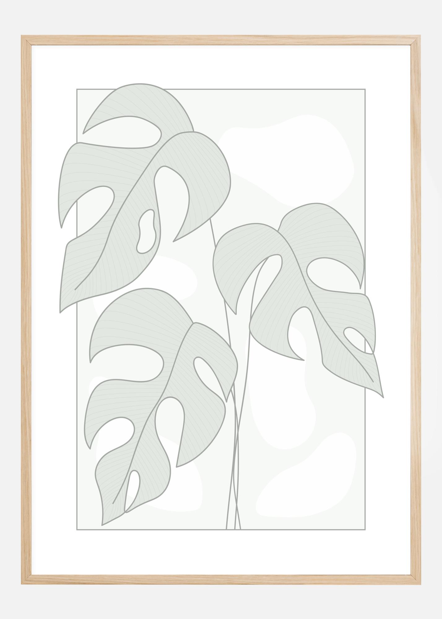 Un semplice poster con illustrazioni di foglie di monstera. Tre grandi foglie riempiono l'immagine, ognuna in una tonalità grigia morbida. Linee più sottili rappresentano i gambi mentre queste eleganti foglie con buchi pendono in questa immagine. Mantienilo discreto appendendolo su una parete verde morbida per una sensazione naturale.