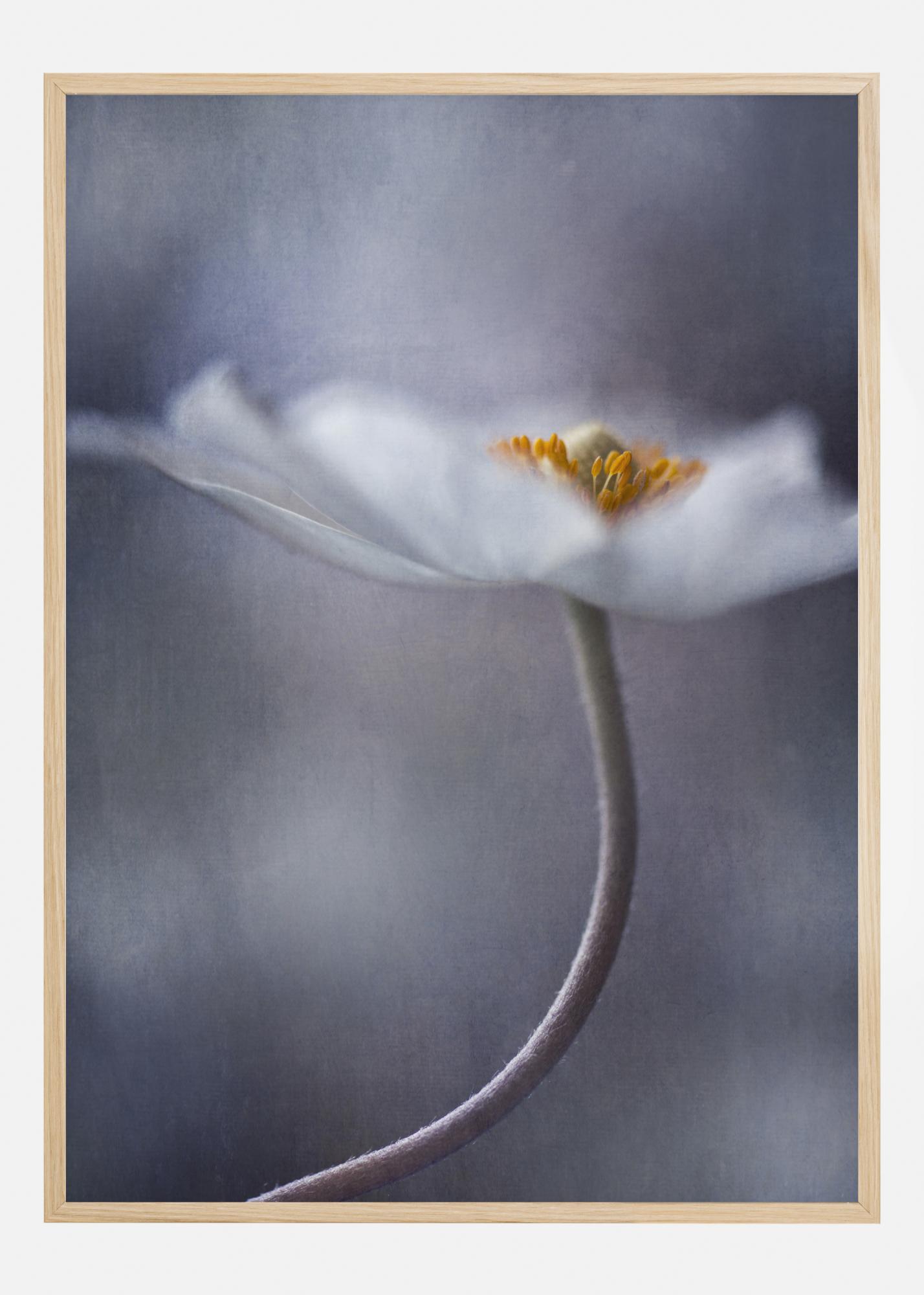 Un poster floreale con un primo piano di un fiore bianco su uno sfondo grigio morbido. Il centro arancione del fiore spicca sullo sfondo attenuato, creando un punto focale luminoso e mettendo in evidenza la bellezza del fiore sia all'interno che all'esterno. È etereo e magico e irradia pace.