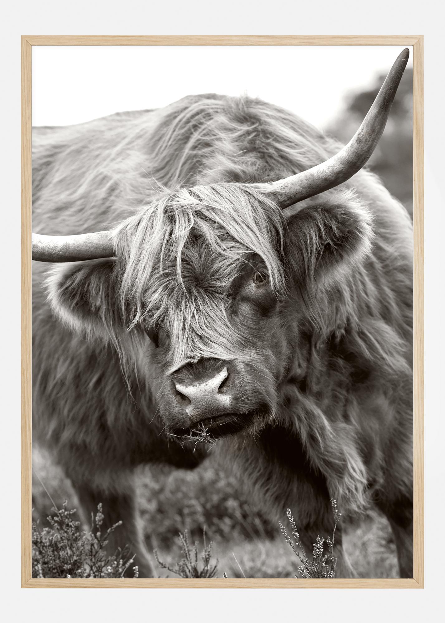 Un poster con un toro delle Highlands. Il toro si inclina nell'immagine con il pelo che cade sugli occhi. Un occhio guarda verso la telecamera e il suo morbido e lanoso pelo cattura la luce quando si muove. Nonostante le corna, il viso dell'animale è morbido e affascinante, si può quasi sentire il naso umido.