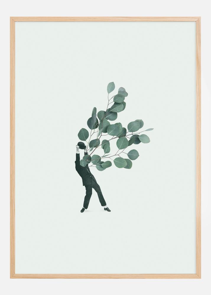 Questo poster artistico ed elegante presenta una silhouette minimalista di una persona che porta un rigoglioso bouquet di foglie di eucalipto, un'espressione visiva che è tanto semplice quanto potente. Il contorno nero della figura contro lo sfondo chiaro contrasta nettamente con le morbide sfumature verdi delle foglie di eucalipto, creando una sensazione di natura pacifica in armonia con la presenza umana.