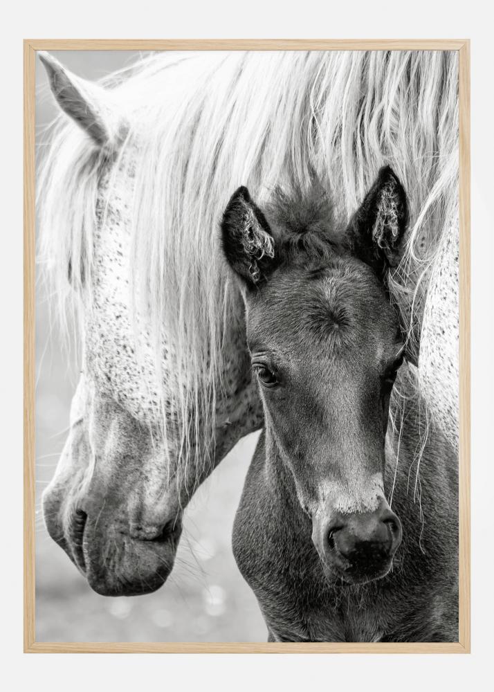 Un poster con una cavalla e il suo puledro. La cavalla protegge il suo puledro e inclina la sua testa bianca sulla sua schiena. Il puledro di colore scuro guarda verso la fotocamera da questa protezione, con le orecchie tese per la curiosità. Goditi questa dolce immagine del bambino.