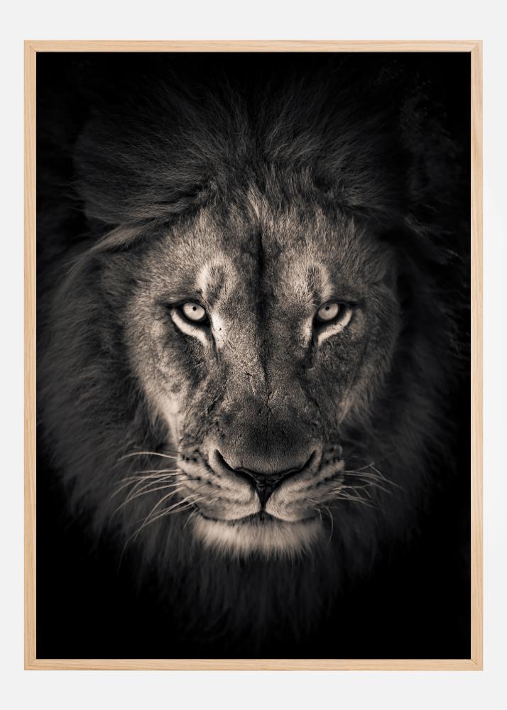 Questo potente e avvincente poster cattura lo sguardo profondo di un leone, offrendo una sensazione della sua forza e presenza. La tonalità in bianco e nero conferisce all'immagine una qualità senza tempo e mette in risalto i tratti maestosi del leone e l'intensità presente nei suoi occhi. È una stampa che emana autorevolezza e la selvaticità, una rappresentazione ideale del 're della giungla'.