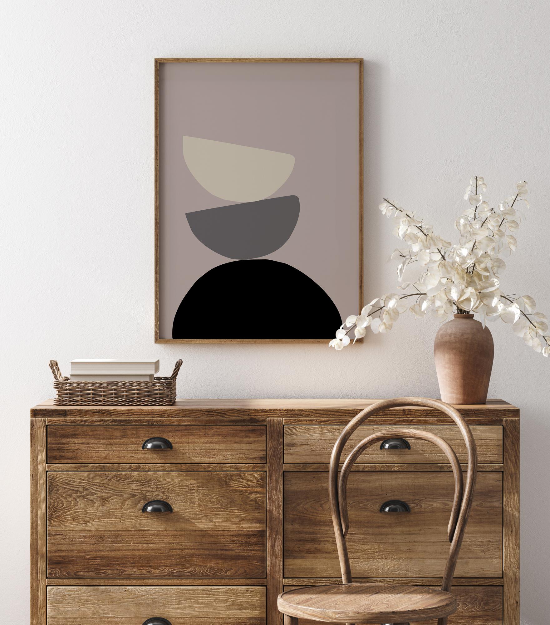 Un poster astratto con tre semicerchi impilati l'uno sull'altro su uno sfondo grigio. Un grande semicerchio nero si trova in basso, un semicerchio grigio medio si bilancia in cima mentre a sua volta bilancia un semicerchio bianco più in alto. Crea un'atmosfera fresca su una parete blu o un'atmosfera più calda su una parete beige o color crema.