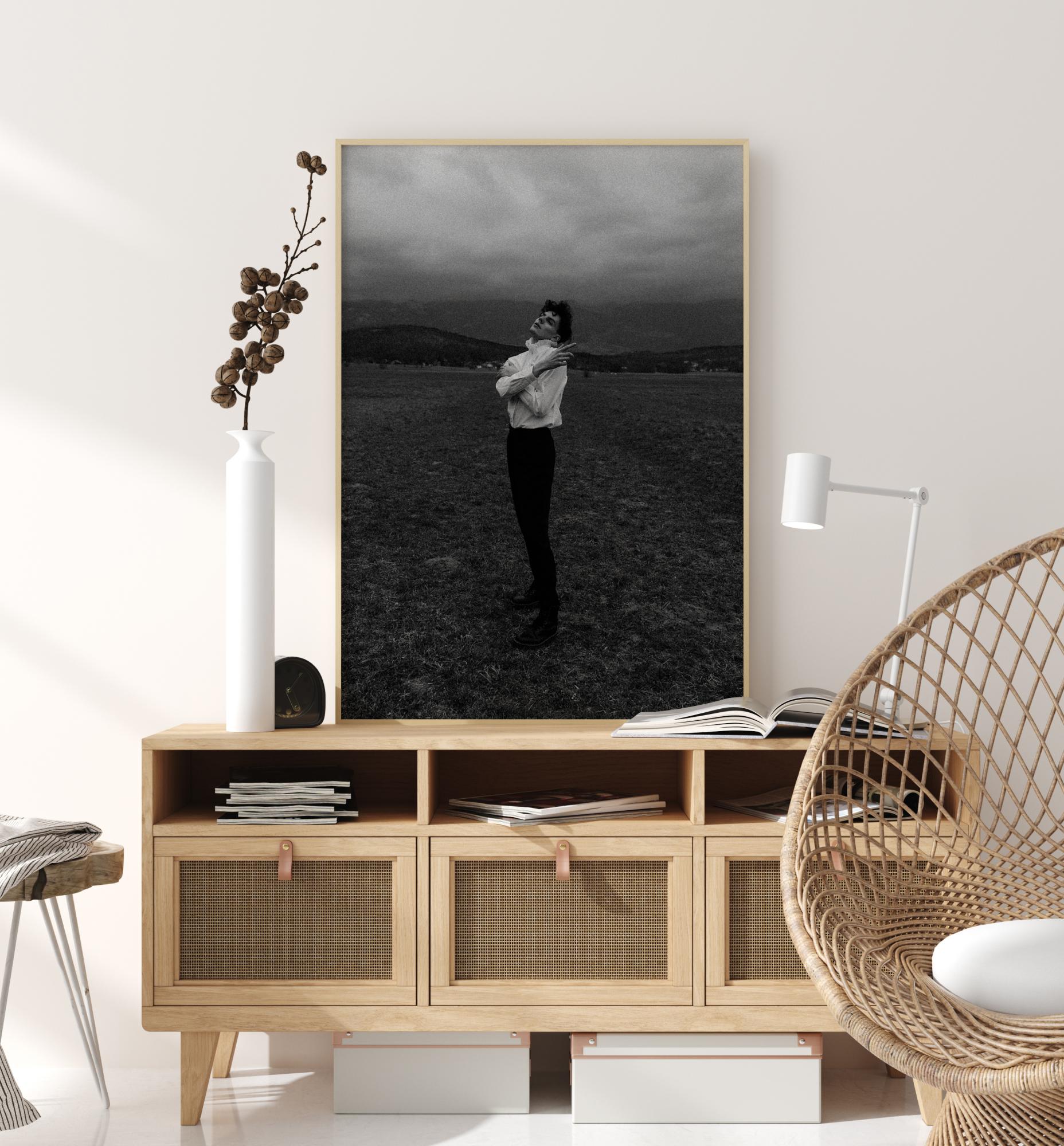 Un ritratto di un uomo spensierato in mezzo a un campo aperto. Le tonalità sottili di nero e bianco danno una sensazione naturale. Goditi questo momento privato catturato per sempre quando lo appendi a casa.