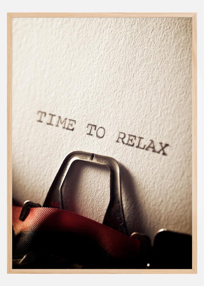 Un poster con il messaggio "Time to relax" scritto su una vecchia macchina da scrivere con il suo classico carattere antico. Un poster elegante e raffinato con un piacevole tocco retrò. Adatto alla maggior parte delle case e degli stili di arredamento.