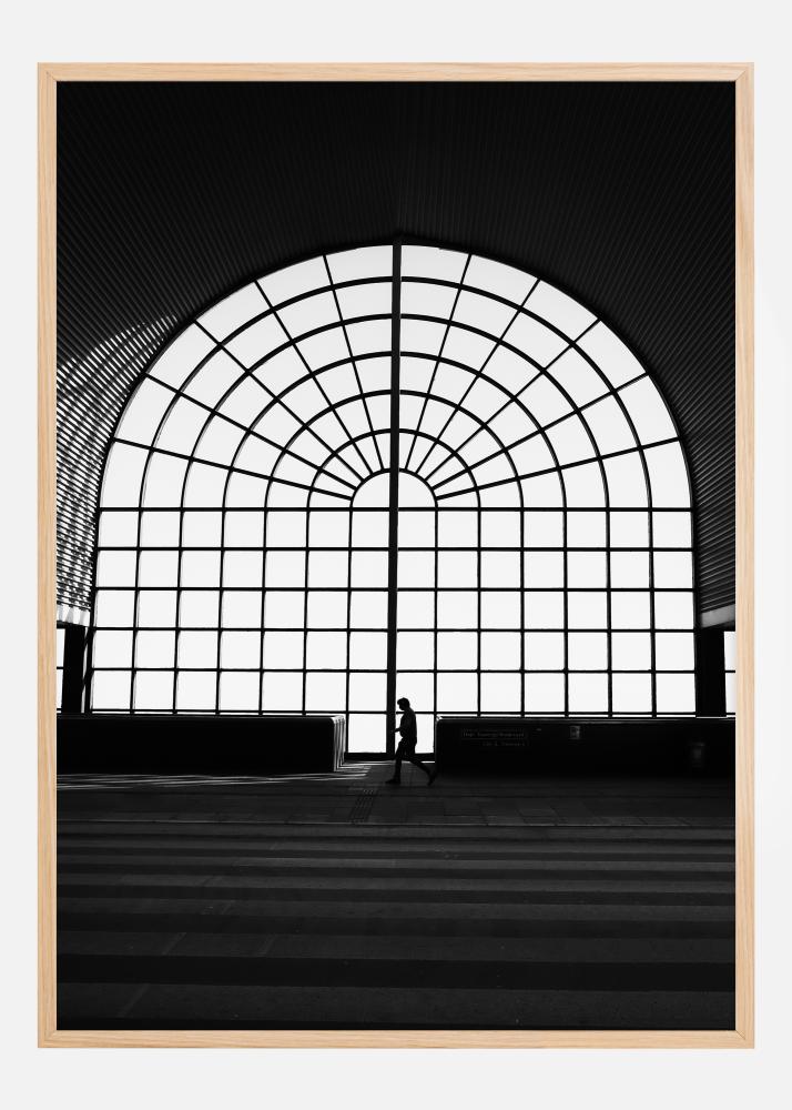 L'opera dal titolo "Time to Travel" rappresenta una figura solitaria che attraversa un'ampia e imponente arcata, chiaramente evidenziata dalla sua simmetria e dai motivi ripetitivi. La grande finestra curvata lascia entrare la luce, creando un drammatico gioco di ombre e luci sul pavimento, che enfatizza la silhouette del viaggiatore solitario. Questa immagine può evocare pensieri di viaggio, transizioni e quei momenti della vita in cui attraversiamo diverse fasi nel nostro percorso personale.