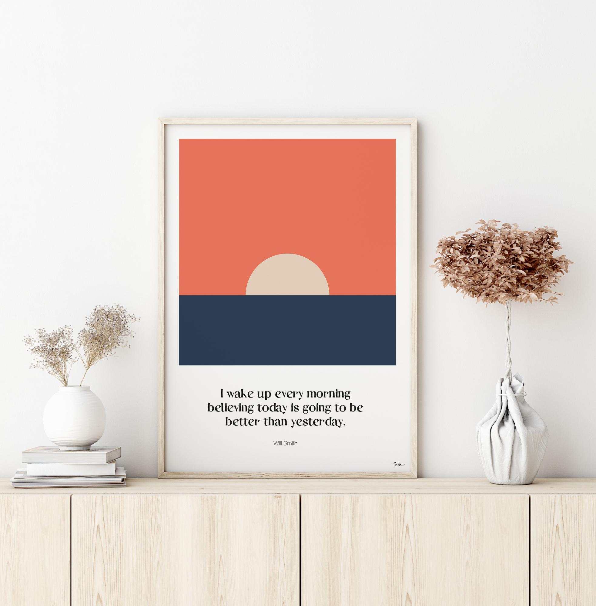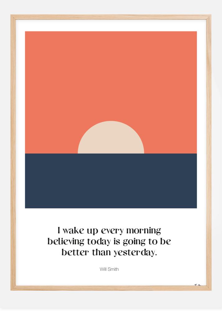 Un poster di testo con la citazione di Will Smith "Mi sveglio ogni mattina credendo che oggi sarà migliore di ieri" scritto sotto un'illustrazione grafica di un'alba. Un poster elegante e raffinato creato da Tim Hansson.