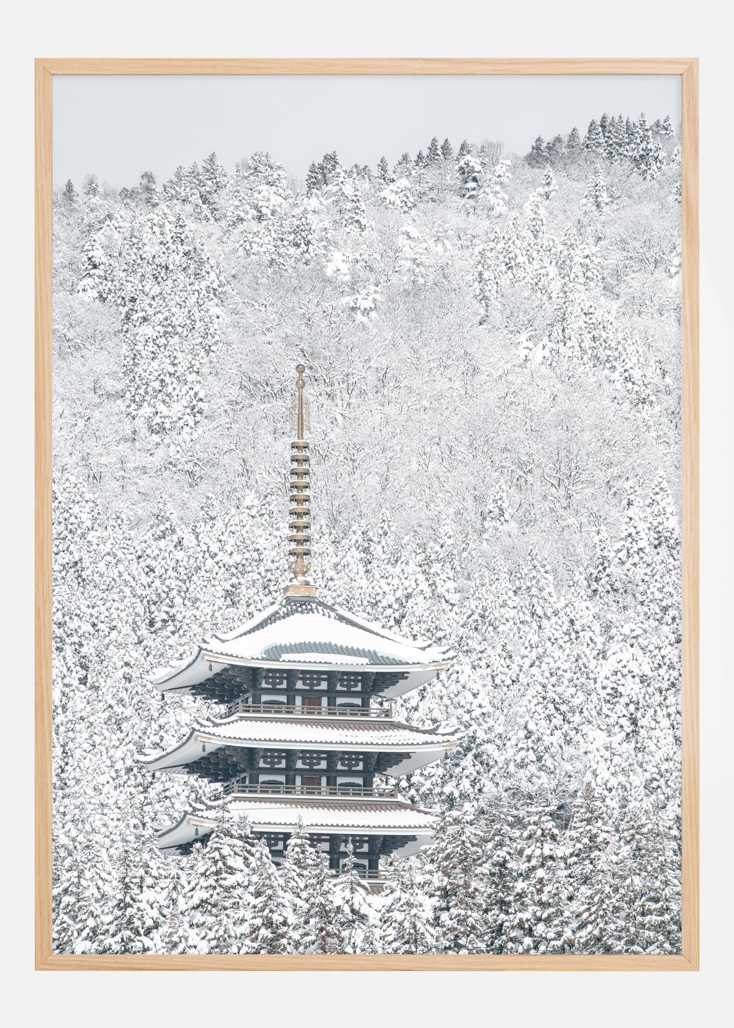 Questo poster suggestivo evoca la sensazione di tranquillità di un paesaggio invernale, dove un edificio tradizionale pagoda dell'Asia orientale si erge maestosamente circondato da un mare di alberi carichi di neve. Il sottile contrasto tra l'architettura delicata e gli alberi robusti e rigogliosi, tutti avvolti in uno spesso strato di neve, crea un'immagine di silenzio e isolamento. Questa stampa cattura perfettamente la bellezza solitaria della natura invernale, dove le sfumature del bianco variano da una luce intensa e radiosa a toni morbidi e attenuati.