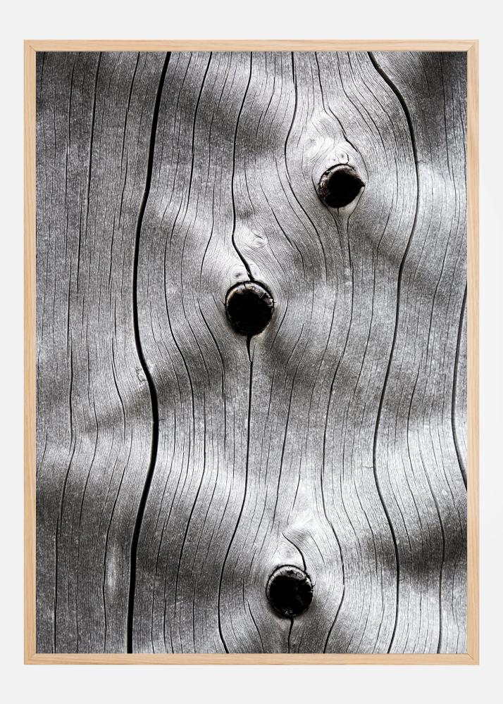 Un macro poster con un tronco d'albero con tre buchi. Le venature del legno sono nitide e si intrecciano verso l'alto. Tre buchi scuri si aprono in diversi punti lungo queste linee, conferendo al tronco una sensazione di texture. Appendi questa immagine su una parete verde per ottenere una sensazione più naturale.