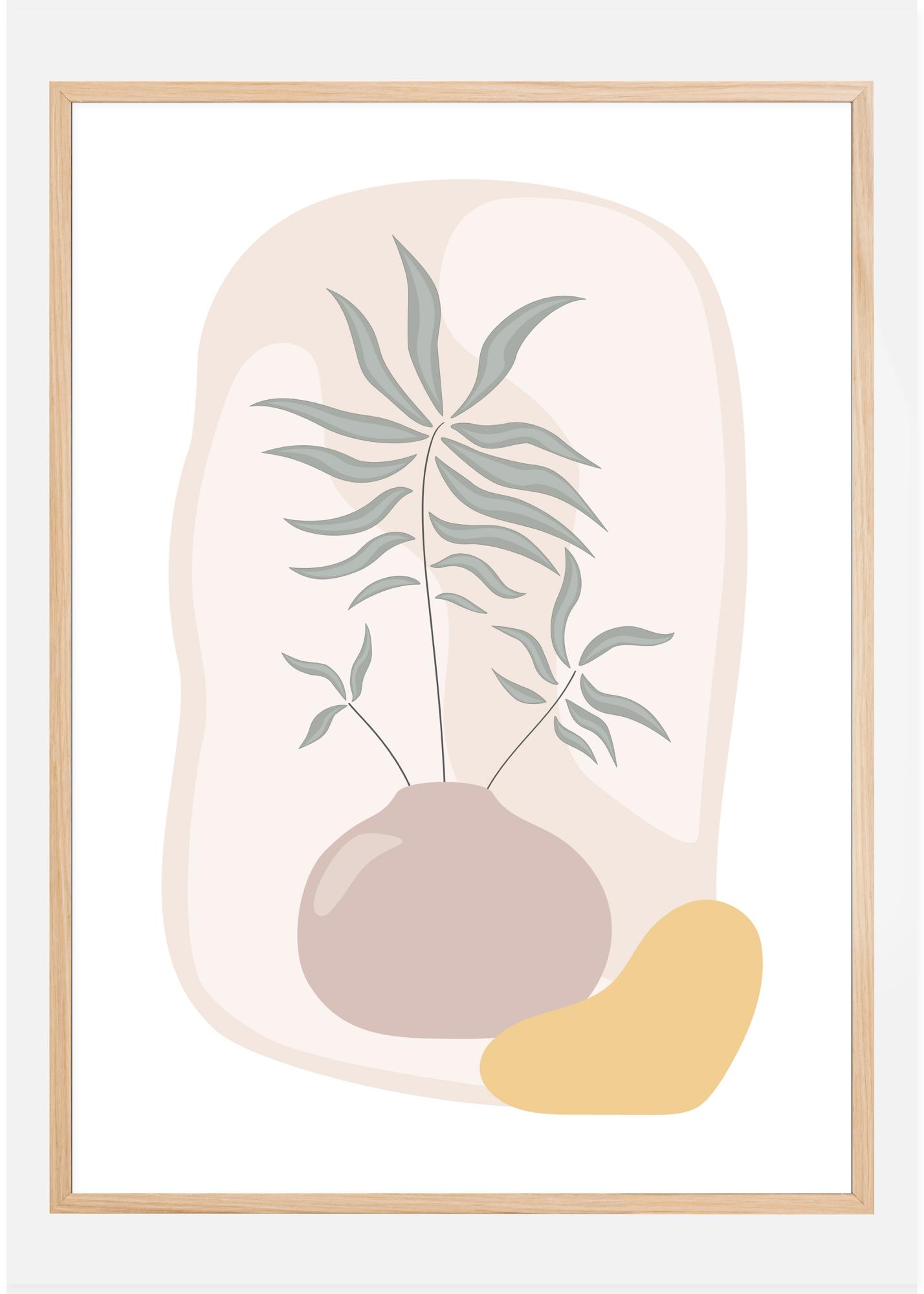 Un poster stilizzato con un vaso contenente una pianta verde che spunta da esso. Altre forme e colori strani riempiono lo sfondo e rendono questa opera interessante ma leggermente astratta. Abbinatela a un disegno nello stesso stile per creare una propria mini galleria a casa.