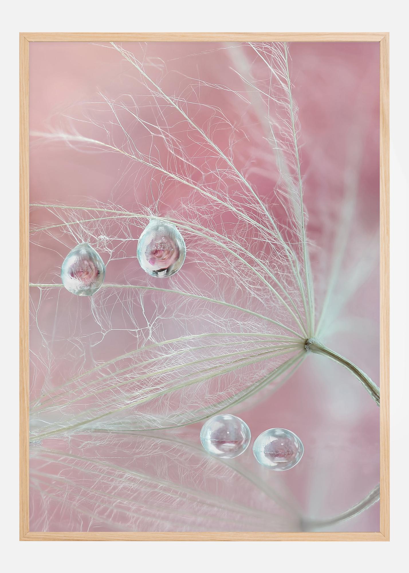 Un elegante poster con una testa di fiore a forma di ragno, con due gocce d'acqua sulle delicate estremità a forma di piuma. Uno sfondo rosa chiaro brilla attraverso ciascuna delle perfette gocce d'acqua mentre pendono appena prima di cadere dal fiore. Goditi l'equilibrio delicato della natura.