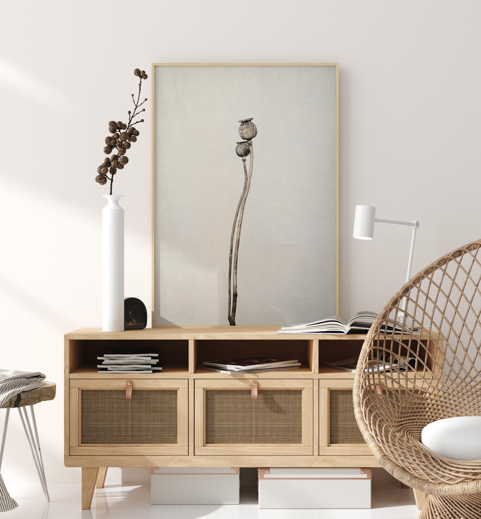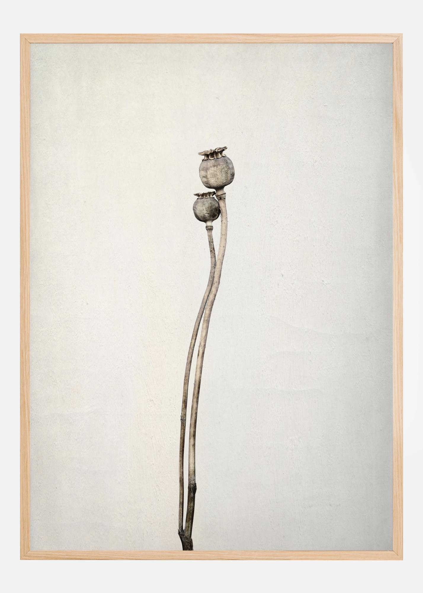 Un poster floreale con due rappresentazioni di papavero intrecciate in una danza. L'immagine in bianco e nero mostra questi due semi di papavero a stelo lungo che si avvolgono su uno sfondo bianco. Questa danza elegante cattura lo sguardo mentre queste teste di papavero si preparano a scoppiare e diffondere i loro semi per coltivare nuovi fiori.