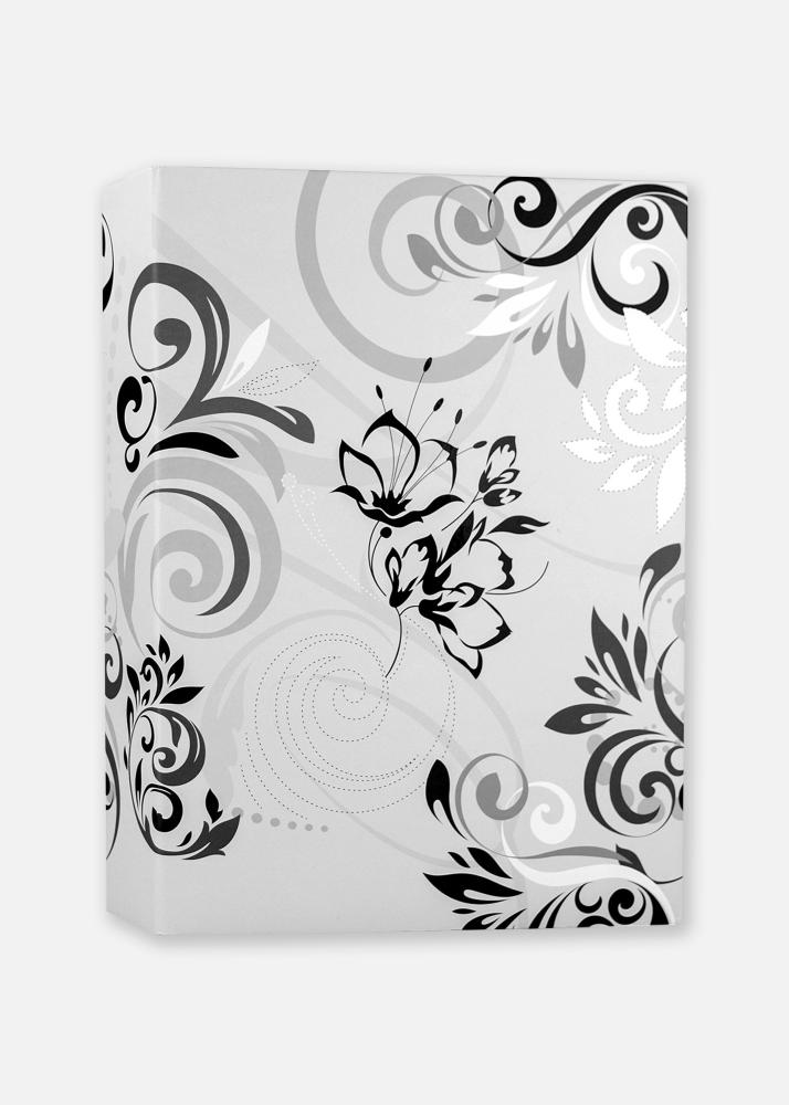 L'album ha copertine robuste con un elegante motivo floreale in nero e grigio. È un album fotografico decorativo che si adatta bene sia sulla mensola che esposto.