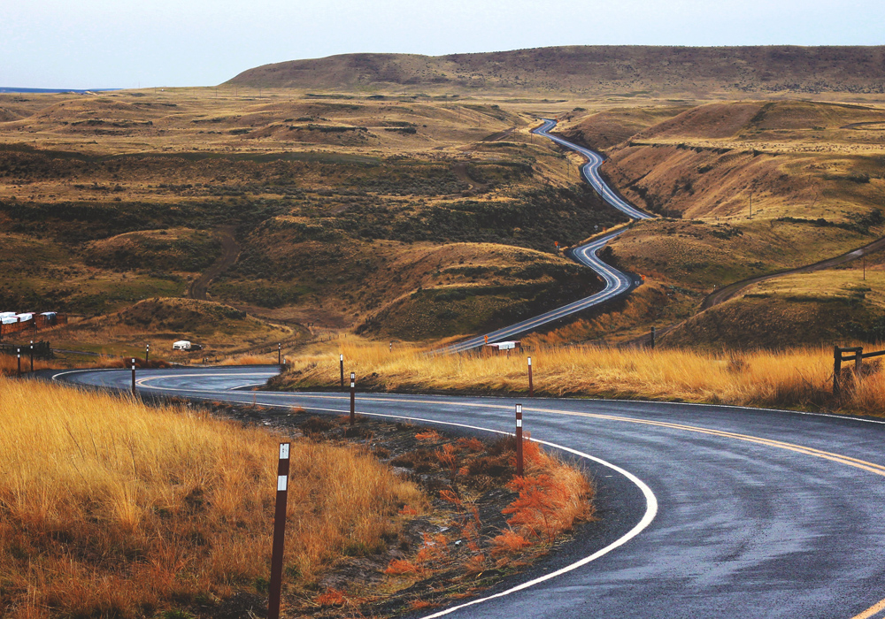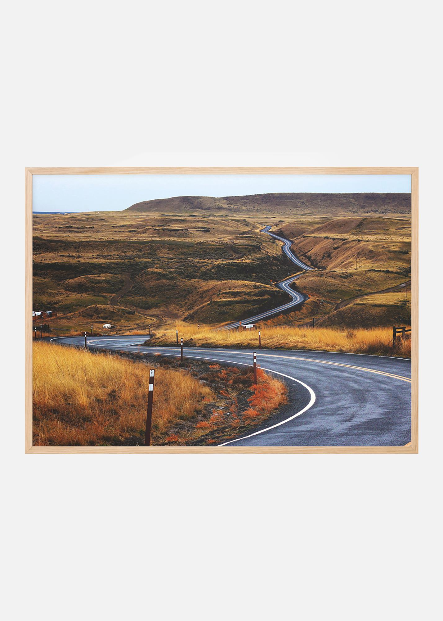 Poster con una strada asfaltata che serpeggia attraverso un paesaggio della steppa bruciato dal sole. Le tonalità di erba giallo-Marronea contro la fredda superficie dell'asfalto che si apre nel paesaggio aperto attirano lo sguardo nell'immagine e seguono la strada. Il poster si adatta bene a una cornice minimalista in cui il motivo può venire valorizzato e può essere combinato con altre tele per un tema.